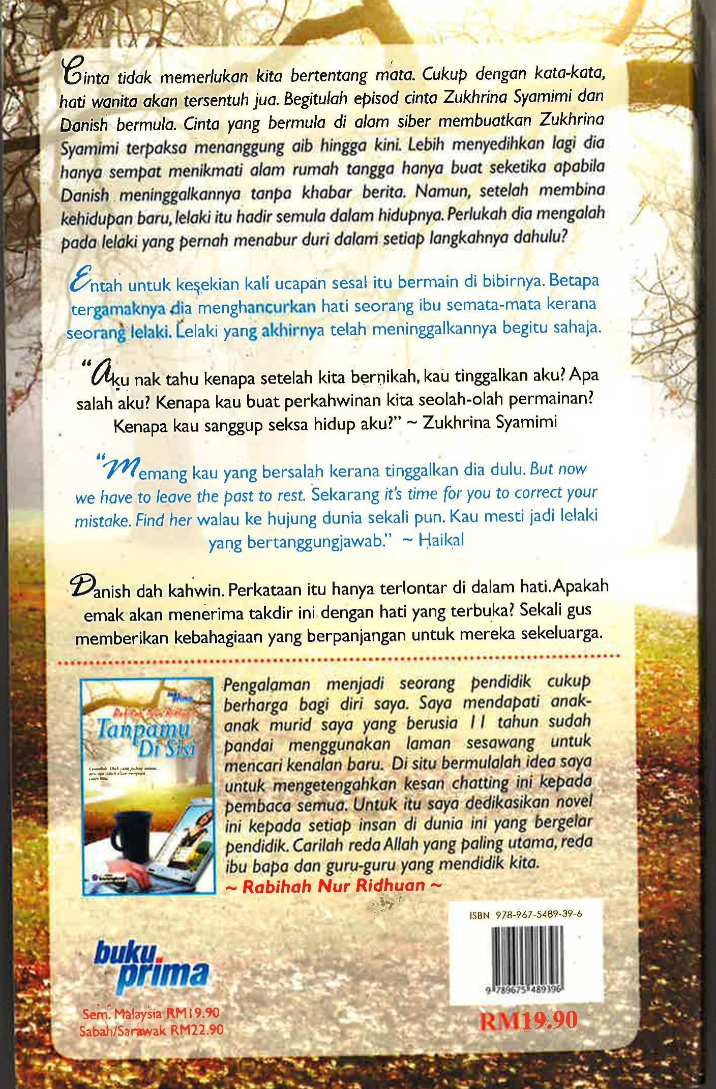 Memang benar cinta itu tidak memerlukan kita bertentang mata. Cukup hanya dengan kata-kata, hati wanita akan tersentuh jua. Begitulah episod cinta Zukhrina Syamimi dan Danish bermula. Cinta yang bermula di alam cyber. Adakah cinta cyber itu lahir daripada kasih nan suci? Tetapi mengapa disebabkan cinta cyber itu Zukhrina Syamimi terpaksa menanggung aib hingga kini? Lebih menyedihkan lagi dia hanya sempat menikmati alam rumah tangga hanya buat seketika apabila Danish meninggalkannya tanpa khabar berita. Adakah dia terlalu percaya dengan kasih suci itu? Mudahnya seorang lelaki menabur janji dan mudah juga mereka pergi. Sedangkan Zukhrina Syamimi terkapai-kapai sendirian setelah ditinggalkan suami dan keluarga. Dalam kepayahan Zukhrina Syamimi cuba bangkit demi sebuah harga diri. Dia tidak mahu terus mengalah pada putaran takdir yang tidak pernah berpihak padanya. Akhirnya setelah dia berhempas pulas membina kehidupan yang penuh gemilang tiba-tiba lelaki itu hadir semula dalam hidupnya. Menjadi pengemis cinta padanya. Perlukah dia mengalah pada lelaki yang pernah menabur duri dalam setiap langkahnya dahulu? Sedangkan dia tidak mampu lagi untuk mengutip kasih ibu yang jauh tercicir.