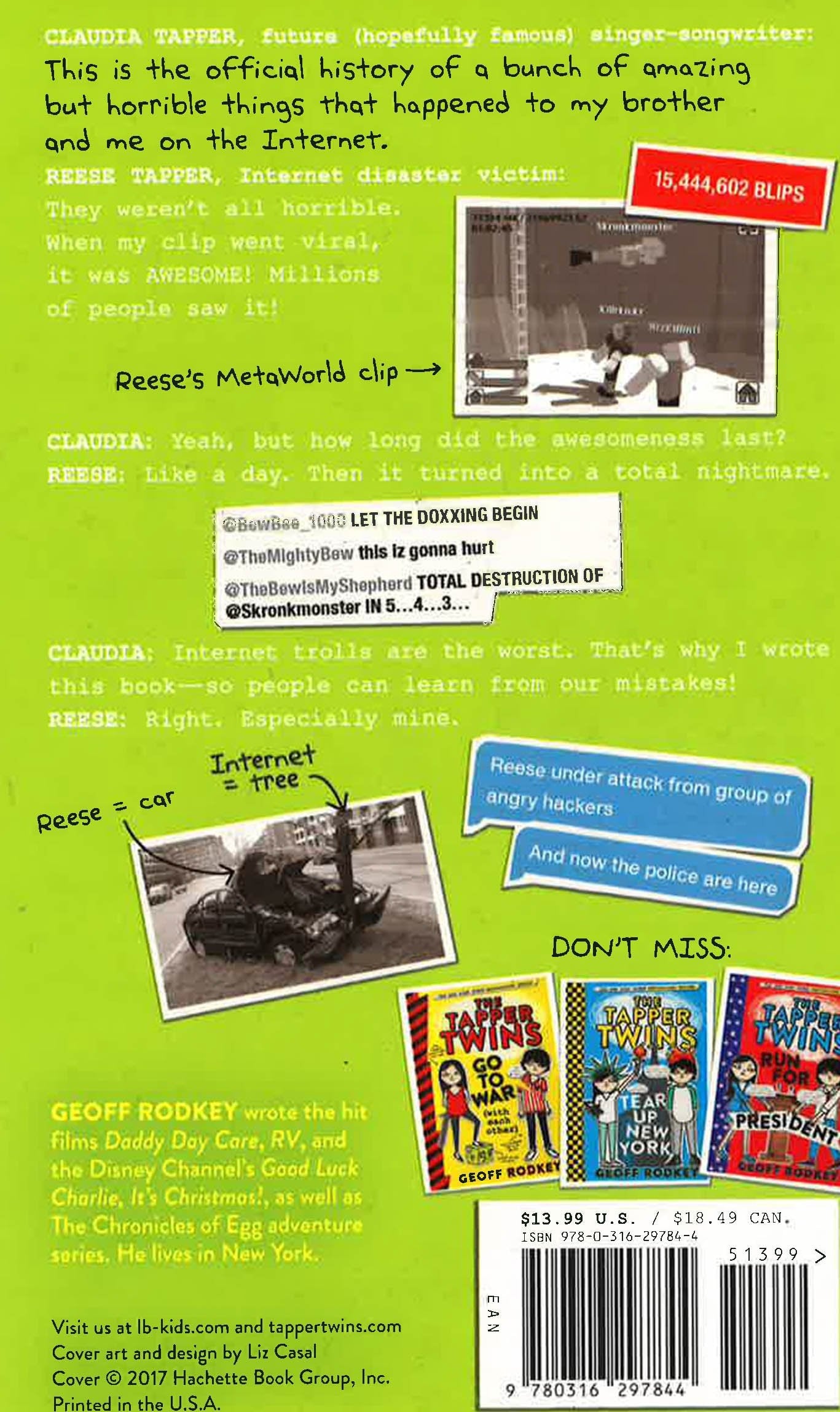 Told as a series of interviews, photos, texts, social media hits, and videogame screenshots, The Tapper Twins Go Viral is a laugh-a-page story about online fame and shame, with internet pro-tips and a serious lesson about digital citizenship. Claudia Tapper just doesn't get it: How is it possible that the video of the best breakup song she's ever written is watched by virtually nobody, when her brother Reese's completely moronic 2-second clip of an video game wipeout ends up being the hottest thing online at Culvert Prep? Unfortunately, Claudia's bold declaration of injustice sets the stage for the bet of her life: Which of the Tapper twins can get more online followers in a week? She had better top Reese's rapidly escalating popularity or she can kiss her social life goodbye if she loses the bet and is forced to post the most embarrassing video imaginable!