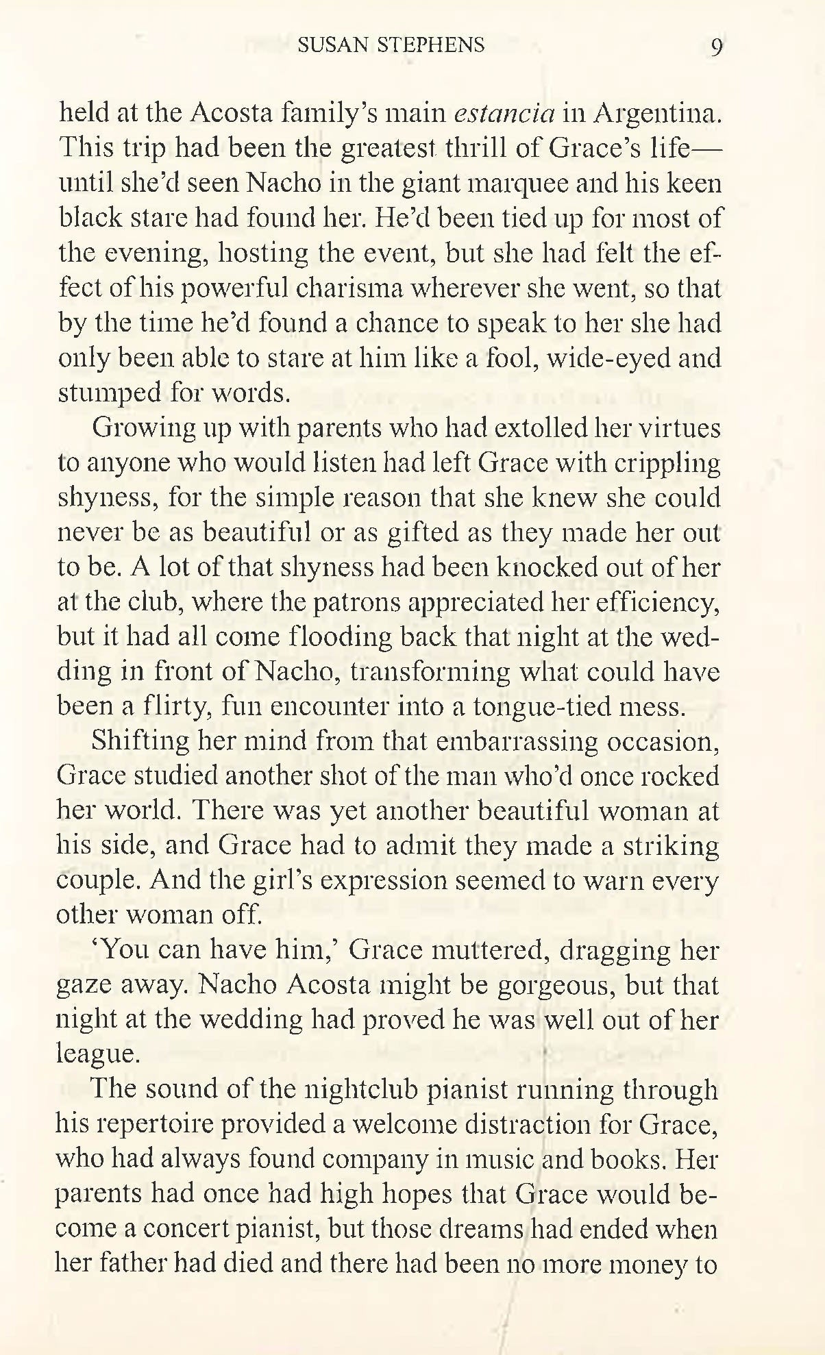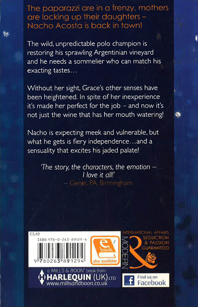 The paparazzi are in a frenzy, mothers are locking up their daughters - Nacho Acosta is back in town! The wild, unpredictable polo champion is restoring his sprawling Argentinian vineyard and he needs a sommelier who can match his exacting tastes... Without her sight, Grace's other senses have been heightened. In spite of her inexperience it's made her perfect for the job - and now it's not just the wine that has her mouth watering! Nacho is expecting meek and vulnerable, but what he gets is fiery independence...and a sensuality that excites his jaded palate! `The story, the characters, the emotion - I love it all!' - Genie, PA, Birmingham