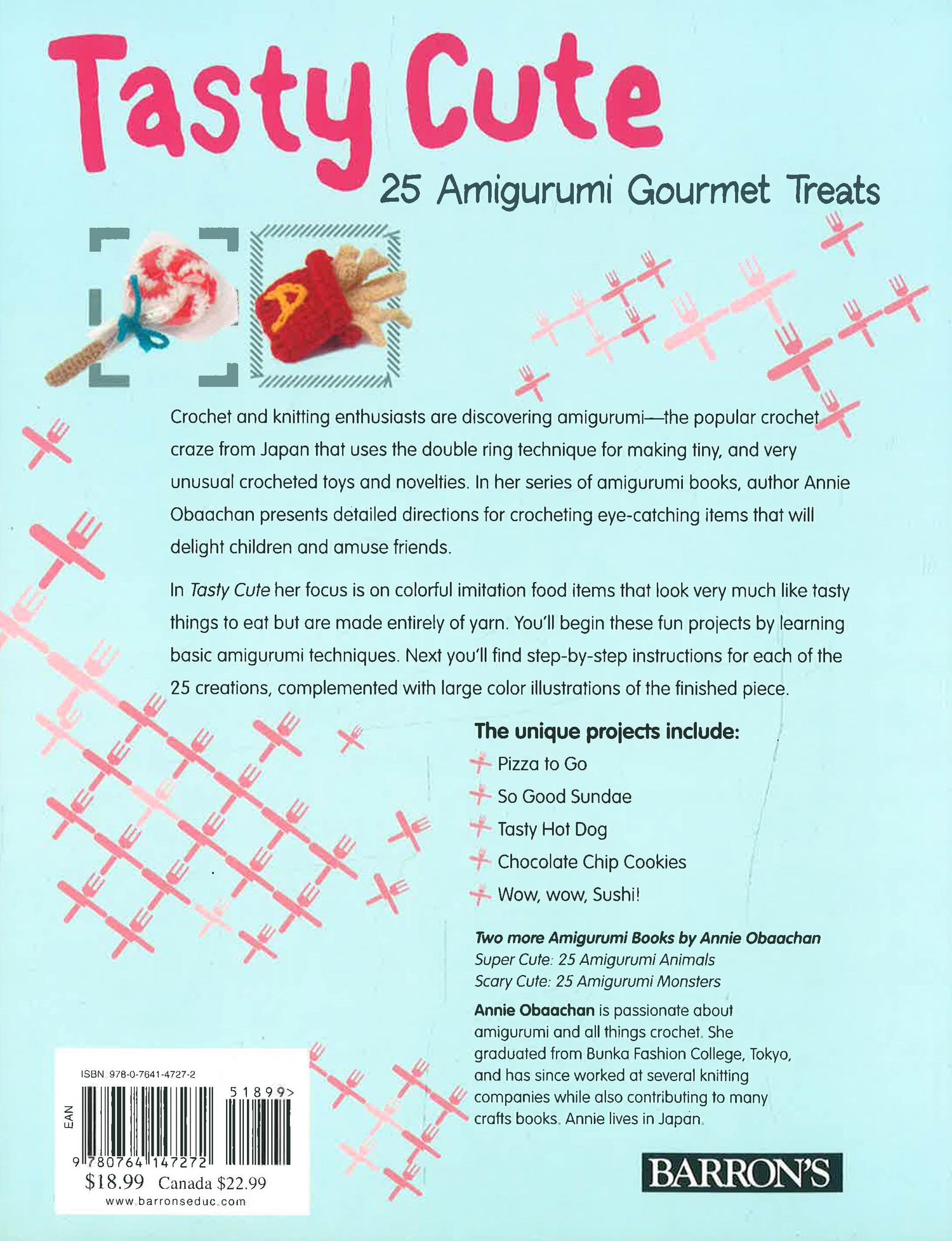 More and more crochet and knitting enthusiasts are discovering amigurumi! It's the popular new crochet craze from Japan that uses the double ring technique to make tiny, cuddly, and very unusual crocheted toys and novelties. "Tasty Cute, " the latest in author Annie Obaachan's series of amigurumi books, gives detailed directions for making truly unique and absolutely eye-catching crocheted toys that will delight children and amuse friends. This book's focus is on bright, colorful imitation food items--a miniature pizza, a hamburger with lettuce and tomato, an ice cream sundae, French macaroons, and 21 more creations that look very appetizing but are made entirely of crochet yarn. Instructions for all projects are presented with lists of required yarns in various colors, as well as crochet hooks, and supplementary materials. Directions for the projects come with large color illustrations of all finished pieces.