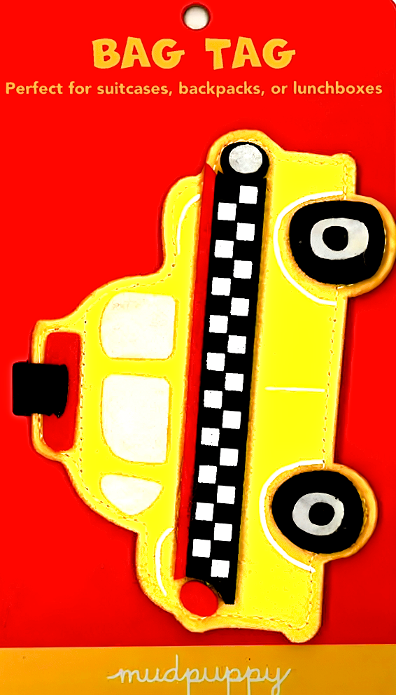 Beep beep! This yellow Taxi Bag Tag will stand out in traffic. Ideal for lunchboxes, backpacks, or suitcases, our tags are made of brightly-colored, durable felt with decorative contrast stitching. A metal buckle and felt strap secures the tag to any bag, and transparent backing protects written information from the elements. Great for traveling, school, or a city adventure! -Stitched felt bag tag with adjustable buckle -Address slot includes personal information card -Perfect for suitcases, backpacks, or lunchboxes -Ages 3+ -Hangable backing card: 4 x 7 1/4 in. (10 1/2 x 18 1/2 cm) show more