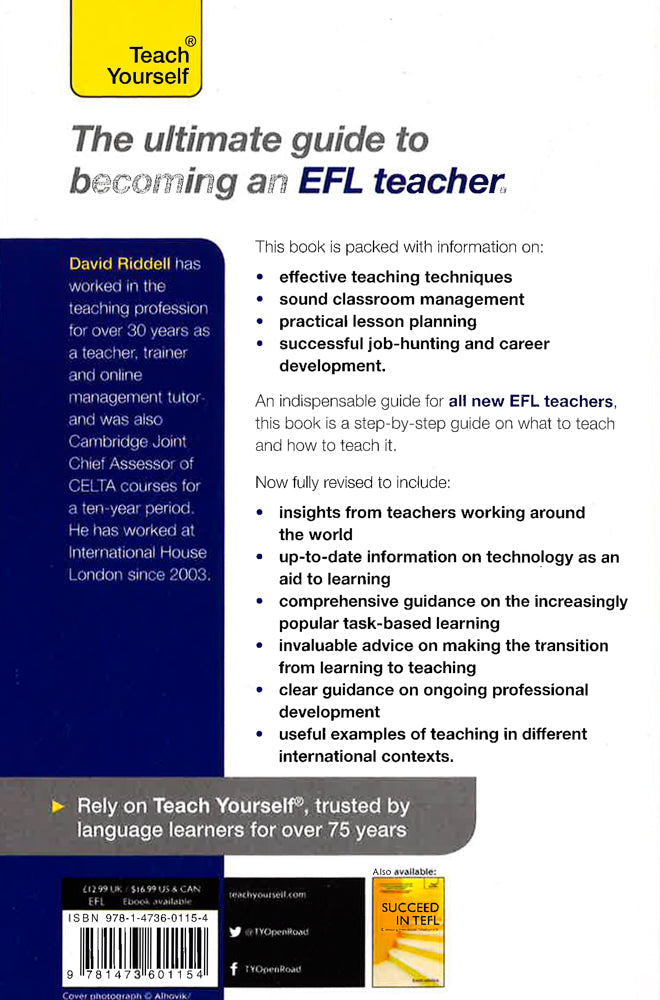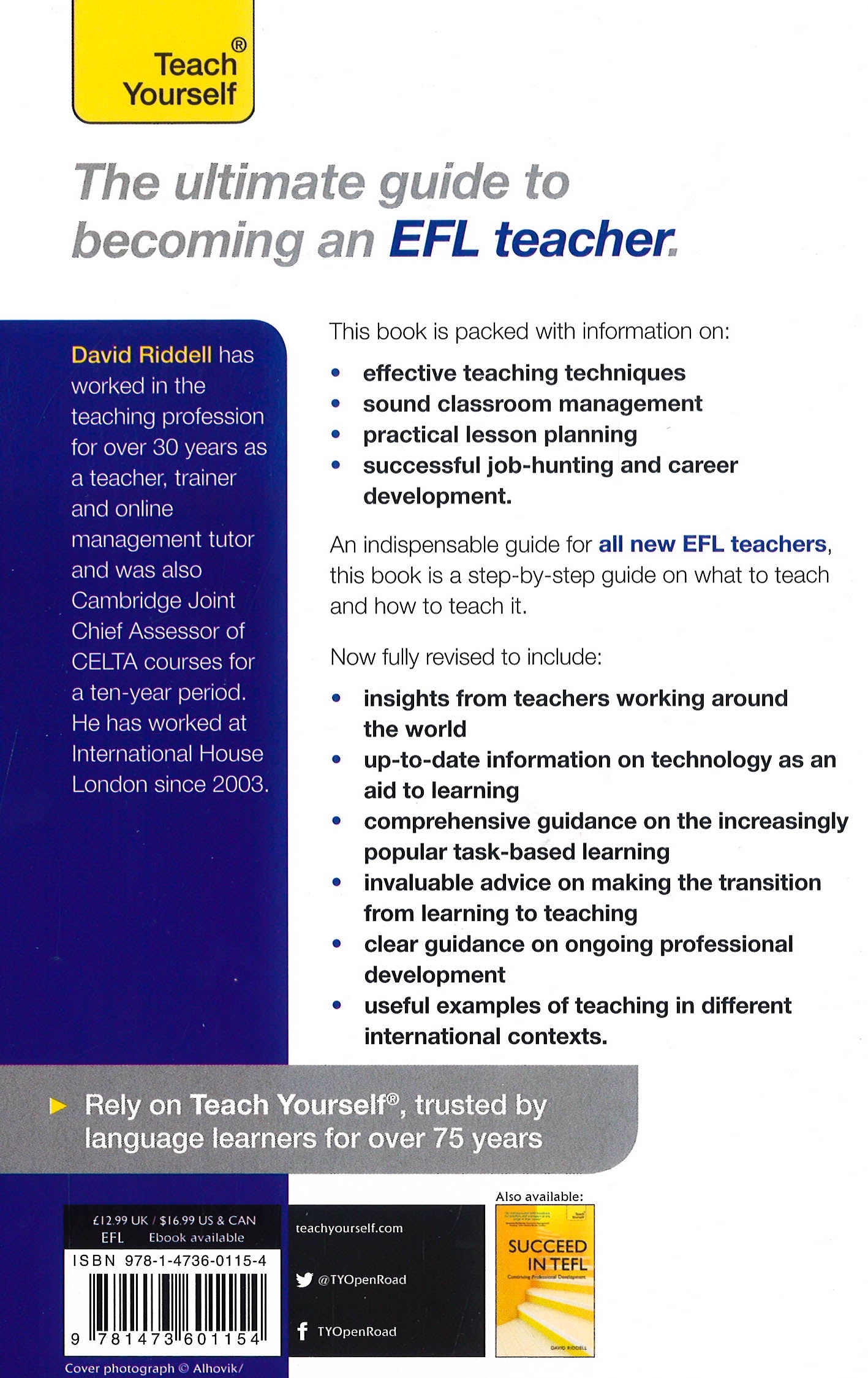 This new edition of Teach EFL is the ultimate practical reference guide to becoming an EFL teacher."Riddell's book is a classic - it answers all those questions new language teachers have....covers an amazing amount in a clear accessible way."David Carr, Director of Teacher TrainingInternational House LondonThis book is packed with information on:-effective teaching techniques.-sound classroom management.-practical lesson planning.-successful job hunting and career development.This is an indispensable book for all new EFL teachers: a step-by-step guide on what to teach and how to teach it. This edition has been fully revised to include:-insights from teachers working around the world.-up-to-date information on technology as an aid to learning.-comprehensive information on the increasingly popular task-based learning.-invaluable advice on making the transition from learning to teaching.-clear guidance on ongoing professional development.-useful examples of teaching in different international contexts.Rely on Teach Yourself, trusted by learners for over 75 years.