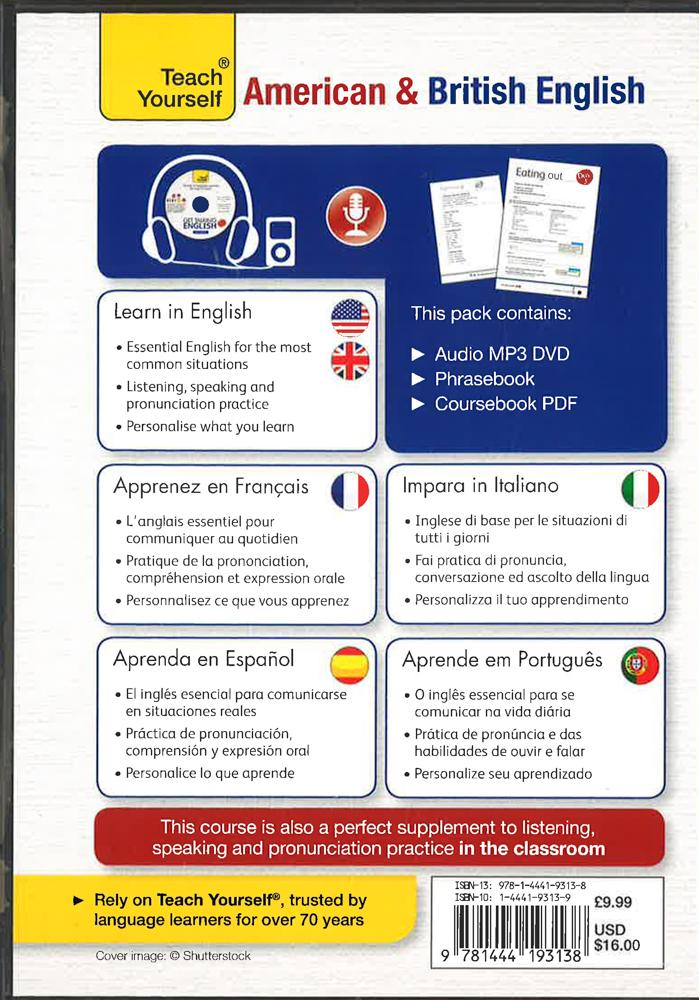 Learn essential American and British English in this complete beginner audio course. This course contains: -One MP3 CD of audio files you can download to your computer or play in an MP3 CD player -A handy phrasebook of vocabulary and phrases -Coursebook PDFs in English, French, Italian, Spanish and Portuguese for reading and writing practice Get Talking English in Ten Days maps to A1 of the Common European Framework of Reference (CEFR) for languages. -Choose your learning language: English, French, Italian, Spanish or Portuguese -MP3 format lets you learn on the go -Practise the words and phrases you need for meeting colleagues and friends, booking a hotel, making plans, shopping and more -Progress in your understanding of naturally-paced conversations -Use the learning plus sections to extend your vocabulary -Personalize the language with interactive role-plays -Perfect your pronunciation and sound more natural *This course is also ideal for use in the classroom for extra listening and speaking practice.* Rely on Teach Yourself, trusted by language learners for over 75 years.