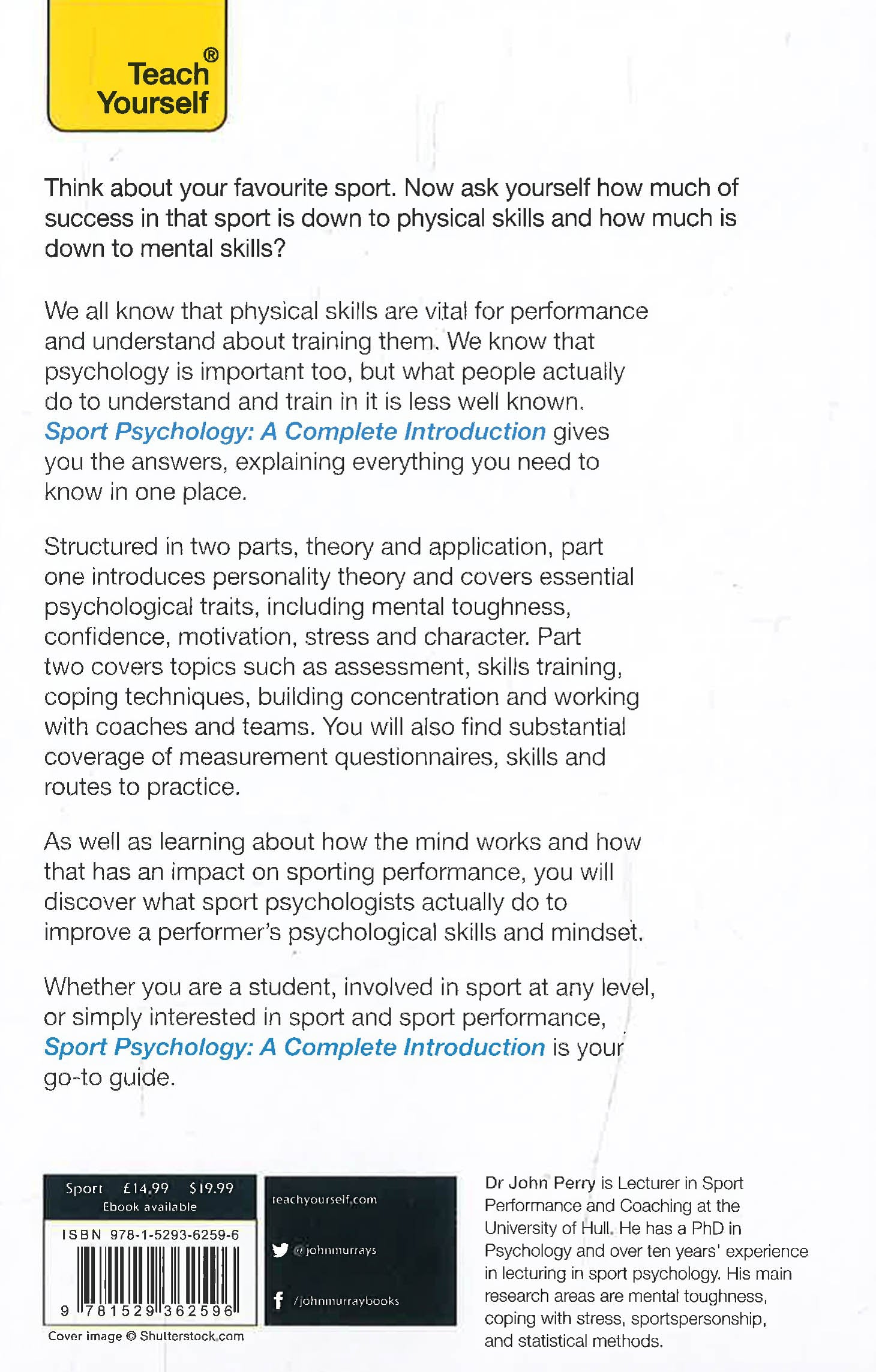 Sport Psychology: A Complete Introduction is designed to give you everything you need to succeed, all in one place. It covers the key areas that students are expected to be confident in, outlining the basics in clear, jargon-free English and providing added-value features like summaries of key experiments and even lists of questions you might be asked in your seminar or exam.