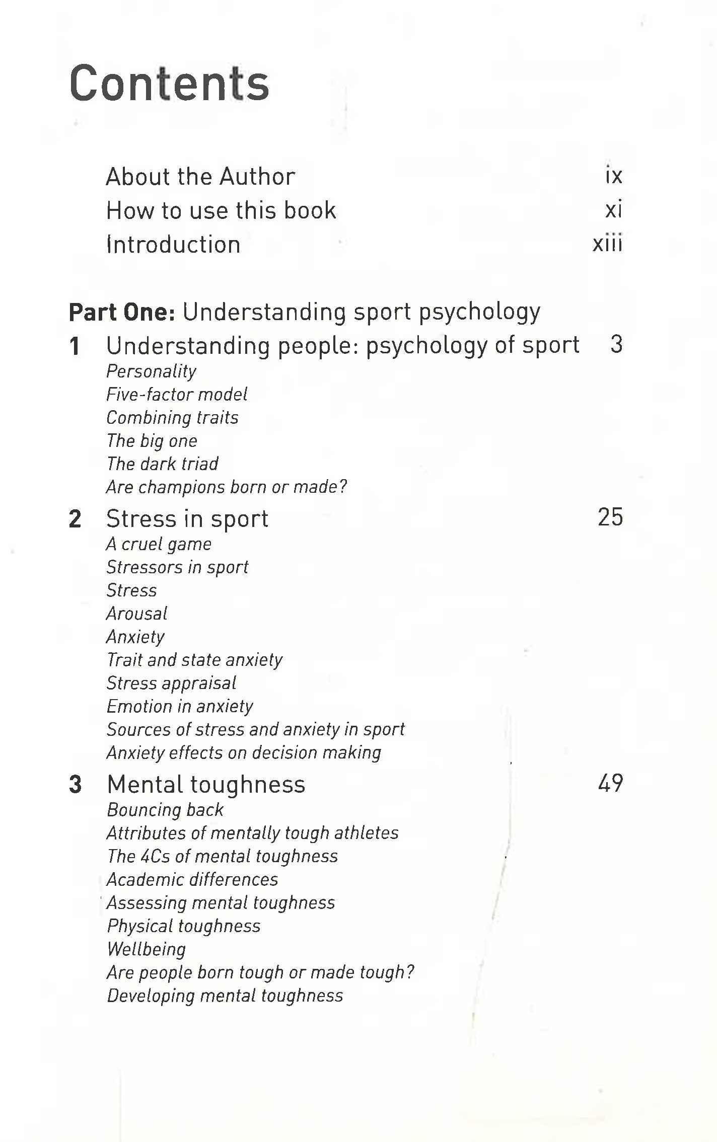 The book uses a structure that mirrors the way sports psychology is taught on many university courses, and is split into theory and application. Chapters in the first part include coverage of essential personality traits, including mental toughness, confidence, motivation and character. The chapters on applied sports psychology cover topics such as assessment, working with groups, skills training, coping techniques and working with coaches and children. There is also substantial coverage of measurement questionnaires, skills and routes to practice.