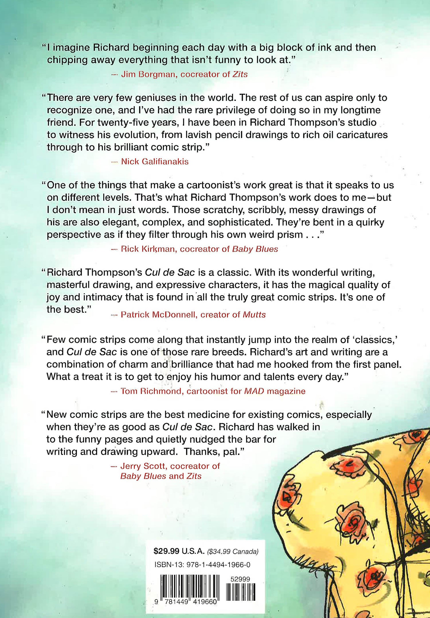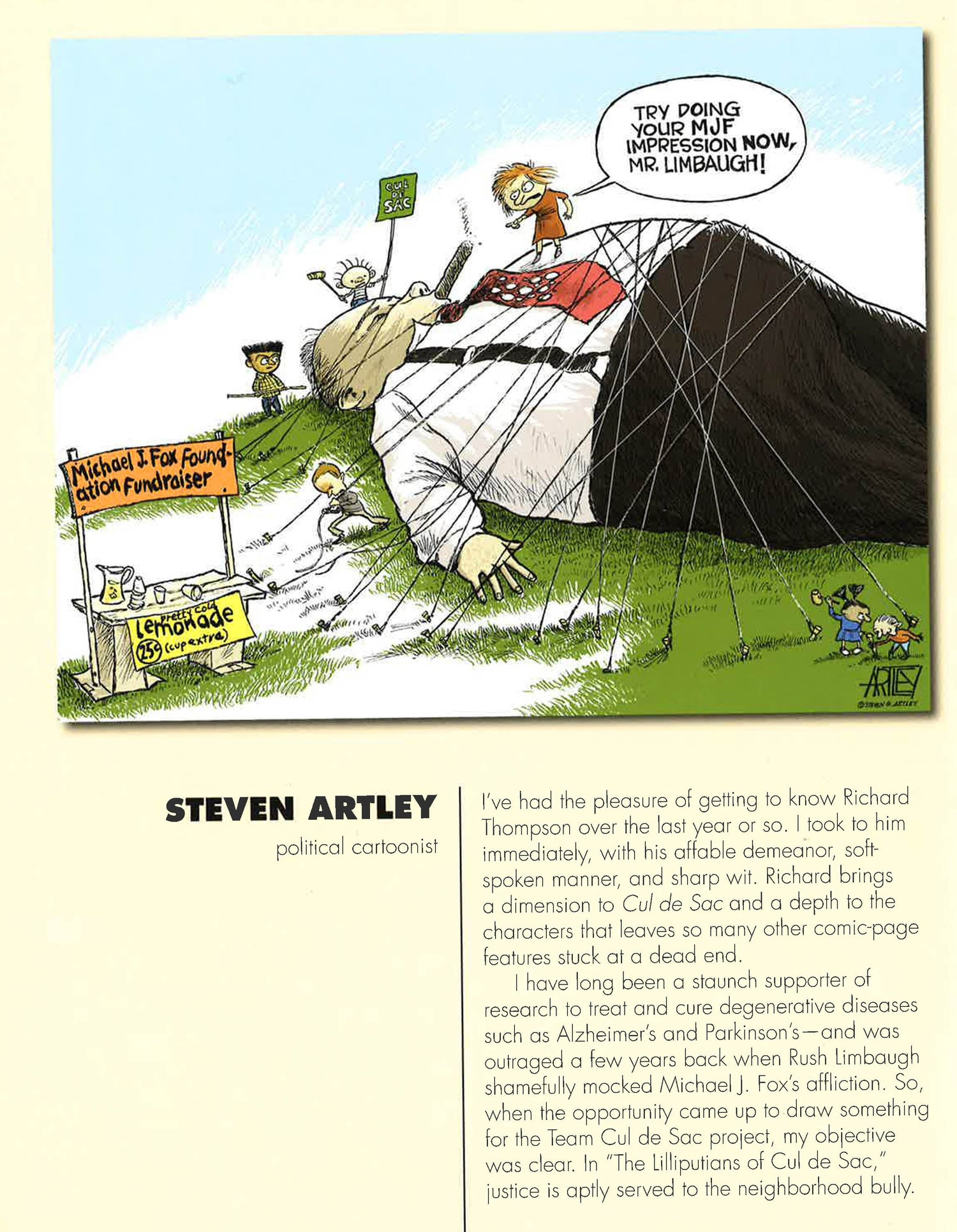When Richard Thompson, creator of the cartoon strip Cul de Sac, learned that he had Parkinson's disease, the entire cartoon community was moved. From other cartoonists to fans, the urge to "do something" was overwhelming. Enter Chris Sparks, friend of and webmaster for Richard, who came up with the idea of joining the Team Fox effort. Having read two of Michael J. Fox's books, he knew about the foundation, which made him think of creating a Team Cul de Sac to honor Richard and to raise money for and awareness about PD. He set up the team with the foundation and began the quest to create a book that contributors would donate their original art to be included in the book and to be auctioned off later. All of the auction's profits will be donated to Team Fox.