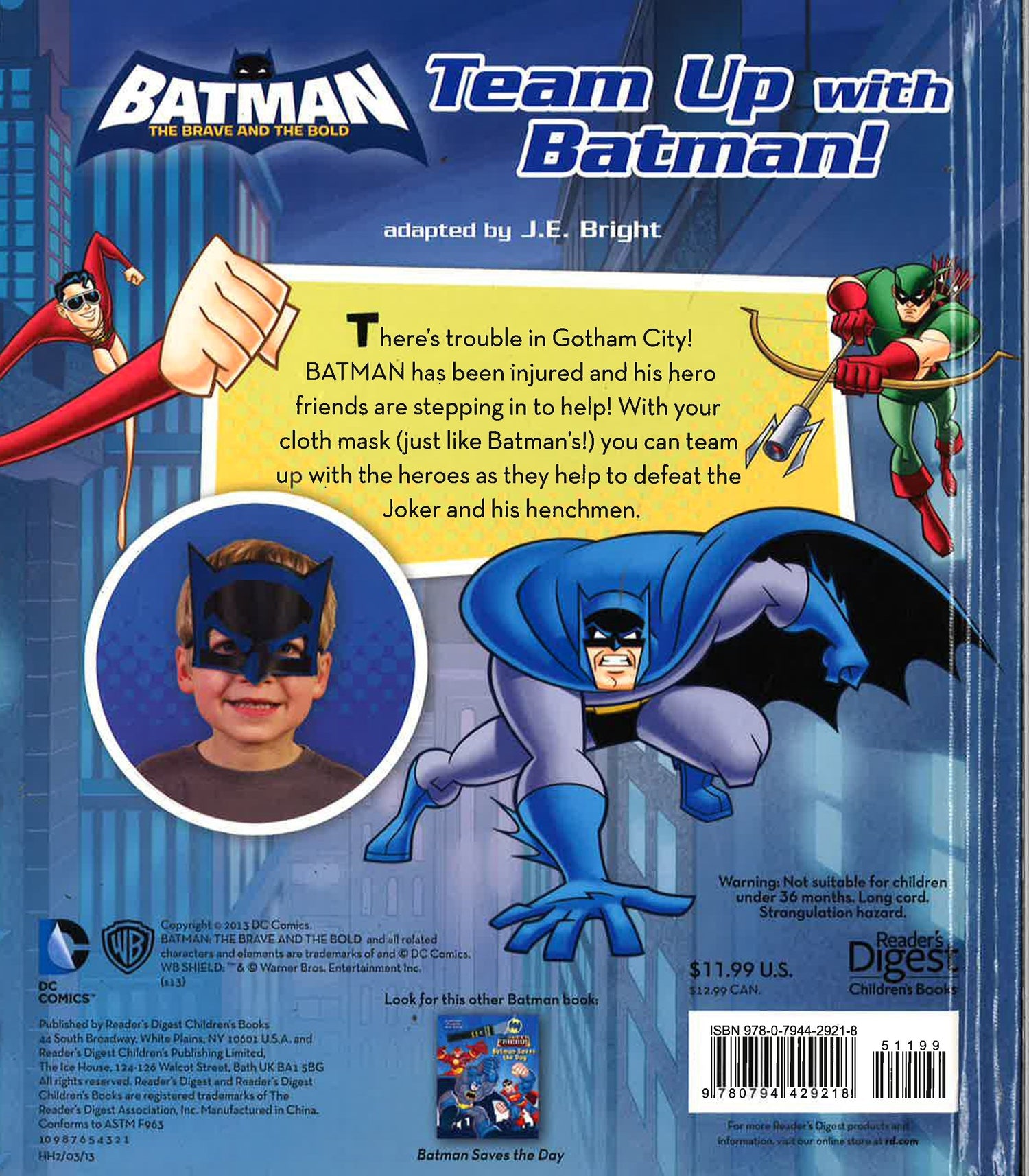 Children will feel like their favorite hero when they read this book while wearing a mask just like Batman's! There's trouble in Gotham City, but no matter who the villain is, Batman is ready to save the day. This awesome storybook comes with a black face mask just like Batman's, so kids can feel like they are part of the action. Sure to spark imaginative playtime!