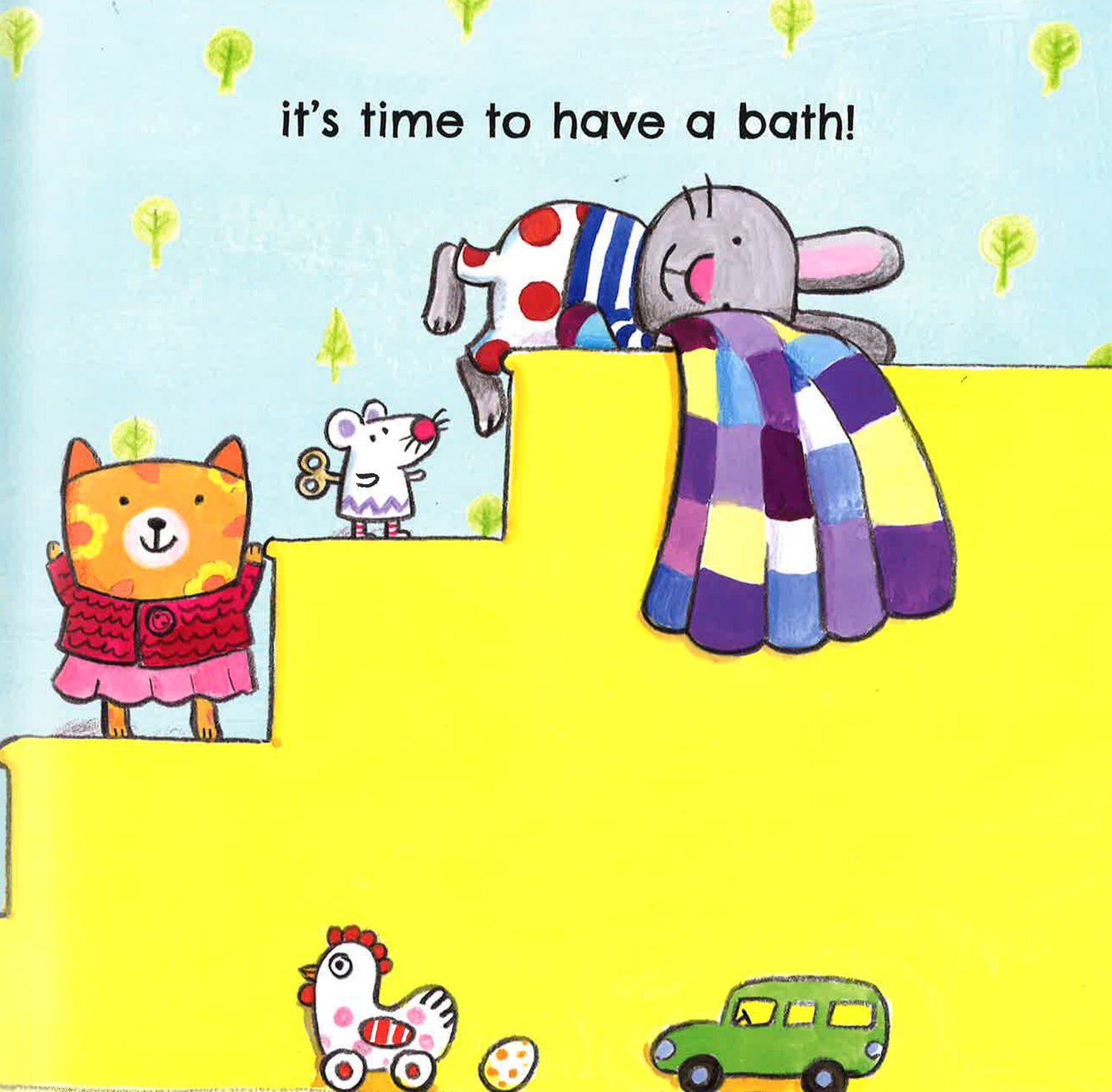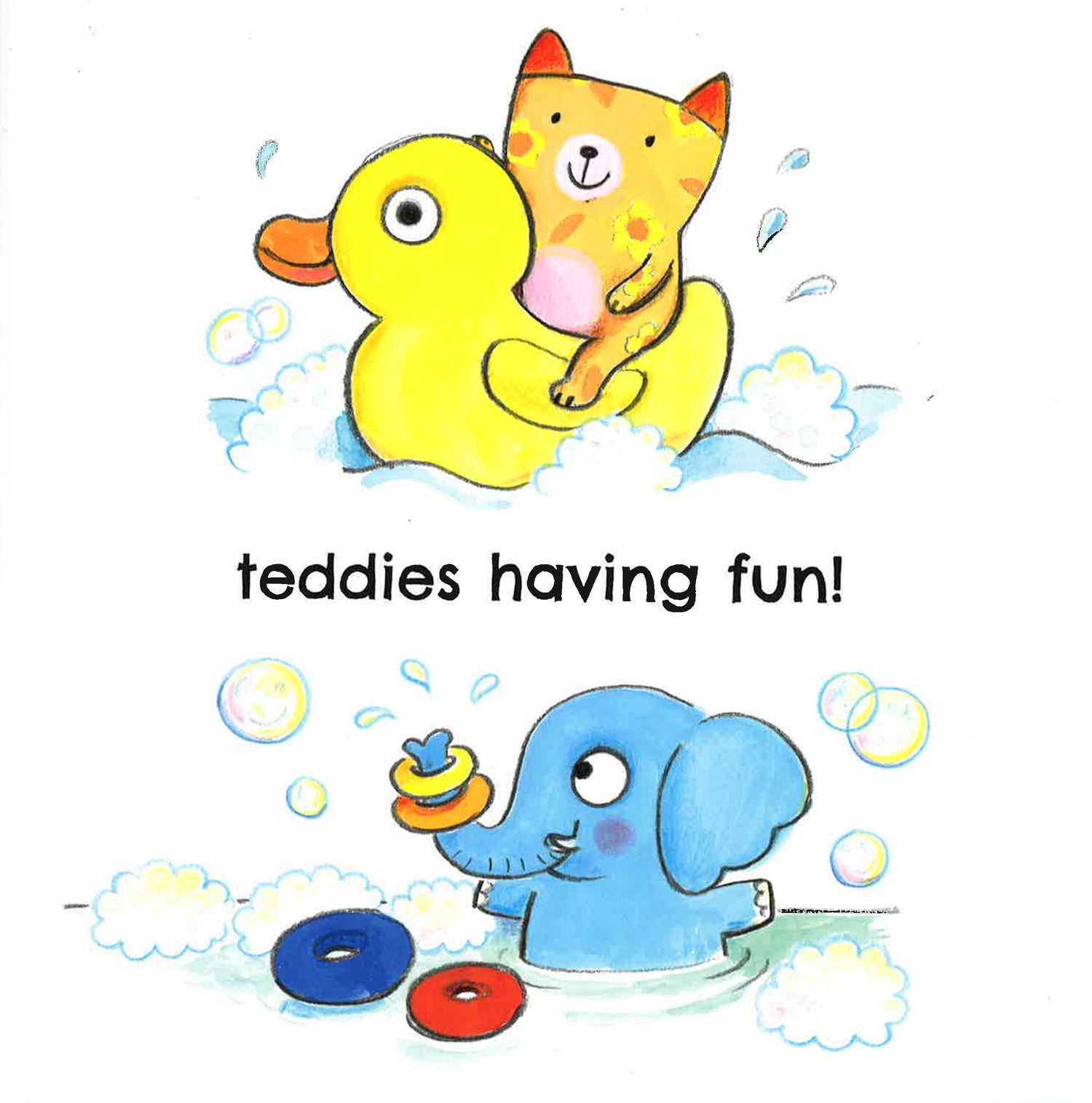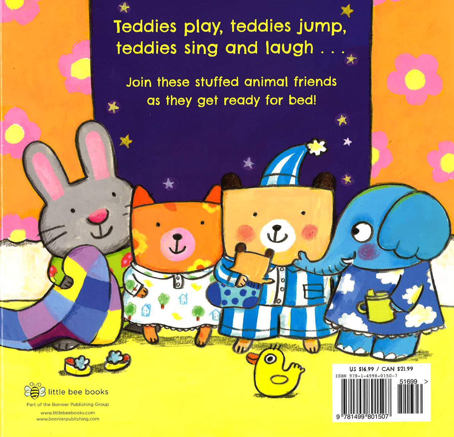 After a day full of playing, these stuffed animal friends are feeling sleepy. So they take their baths, put on their pajamas, and get ready for bed. Now it's time for the teddies to cuddle up and say "Goodnight!".