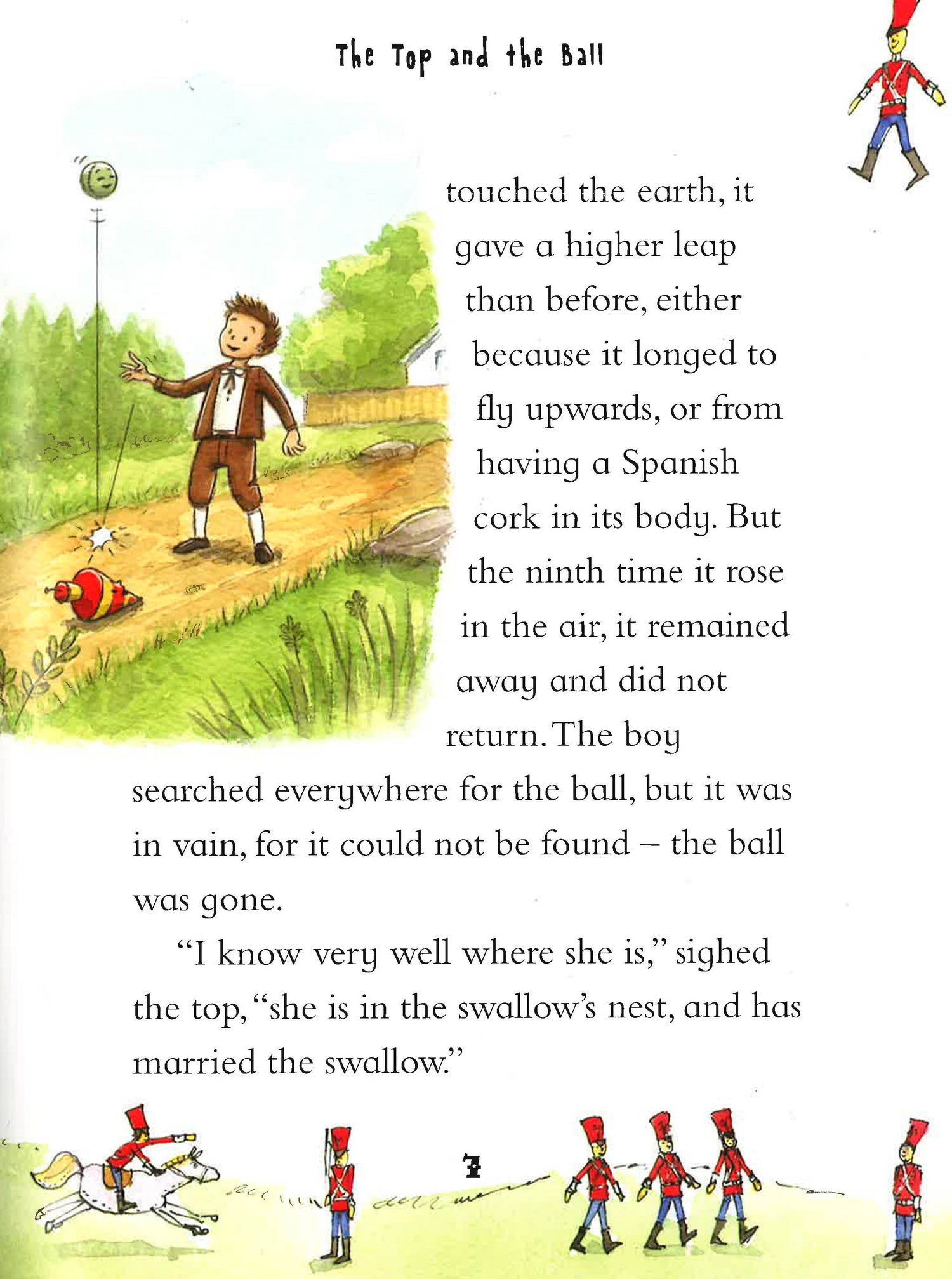 'The Top and the Ball' by Hans Christian Andersen is about a red-and-yellow spinning top that falls in love with leather ball. The top wishes to marry the ball, but she is already engaged to a swallow. One day, the ball goes missing. The top longs for the ball, but will he ever find her?
