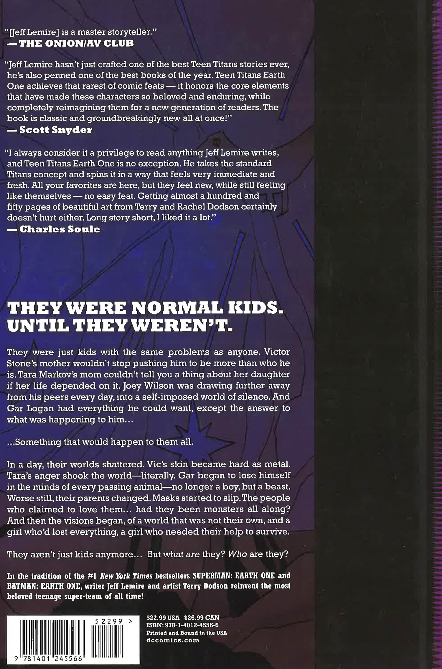 A new original graphic novel in DC's popular "Earth One" series, TEEN TITANS: EARTH ONE follows in the tradition of SUPERMAN: EARTH ONE and BATMAN: EARTH ONE, both of which were #1 New York Times bestsellers. The Teen Titans never felt like normal kids... but they had no idea how right they were. Their seemingly idyllic Oregon upbringing hides a secret -- one that will bring killers, shamans, and extraterrestrials down on their heads, and force them into an alliance that could shake the planet to its foundations! Superstars Jeff Lemire (ANIMAL MAN, GREEN ARROW) and Terry Dodson (WONDER WOMAN) reinvent DC's youngest heroes, with an all-new mythos in an all-new world!