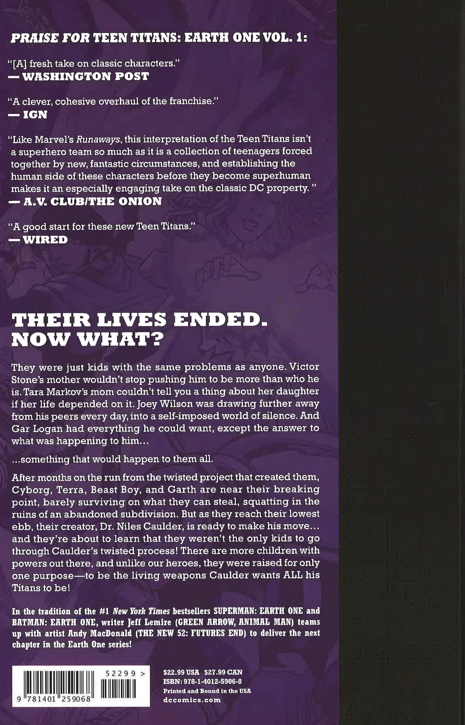 The sequel to the NEW YORK TIMES best-selling original graphic novel is here with TEEN TITANS: EARTH ONE VOL. 2! Picking right up after the cliffhanger ending to the first volume, Cyborg, Beast Boy, Terra and Aqualad are in desperate straits--they're homeless, destitute, and on the run from Cadmus, the project that created them. Unfortunately, Cadmus has more surprises up its sleeve... and a whole new set of teenage weapons, with none of the bothersome morals of the originals! From writer Jeff Lemire (SWEET TOOTH, ANIMAL MAN) and illustrator Andy McDonald comes the highly anticipated sequel to the critically acclaimed original graphic novel in TEEN TITANS: EARTH ONE VOL. 2!