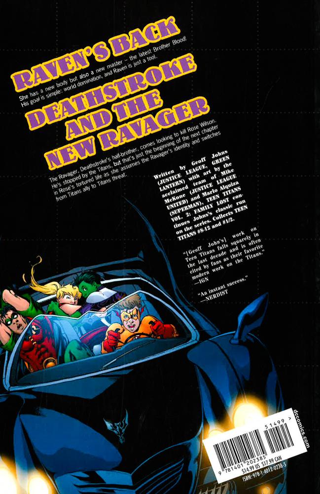 Written by Geoff Johns; Art by Mike McKone, Marlo Alquiza, Tom Grummett, Ivan Reis, Kevin Conrad, Marc Campos, and Norm Rapmund; Cover by McKone and Alquiza Raven returns...with a new body, but also a new master: the latest Brother Blood! The newest adventures of everyone's favorite teen team of heroes unfolds in TEEN TITANS: FAMILY LOST, a 176-page softcover collecting TEEN TITANS #8-12, plus the hard to find TITANS #1/2. This collection is written by Geoff Johns (JSA, FLASH) with art by the acclaimed team of Mike McKone (Exiles) and Marlo Alquiza (SUPERMAN), and additional art by Tom Grummett, Ivan Reis, Kevin Conrad, Marc Campos, and Norm Rapmund. Deathstroke's daughter, Rose Wilson assumes the identity of the Ravager and switches from Titans ally to Titans threat. Now Deathstroke and Rose hunt for the Titans. Could things get any more explosive? They do, when Kid Flash learns to drive!