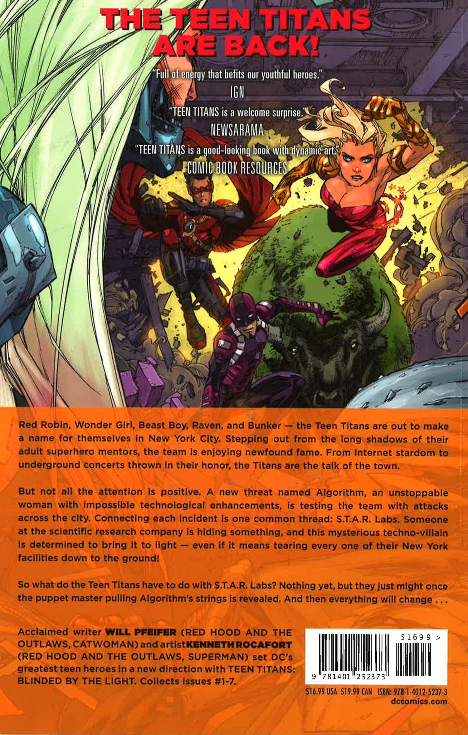 Red Robin, Wonder Girl, Raven, Bunker and Beast Boy step out of the shadows of the adult heroes of the DC Universe to offer bold, exciting and sometime dangerous ideas on how to protect a world full of superpowered teenagers - any one of whom could be the next heroic figure or major villain!This exciting new chapter in the teen heroes' mythos starts here in TEEN TITANS VOL. 1, written by Will Pfeifer and illustrated by Kenneth Rocafort. Collects TEEN TITANS #1-7.