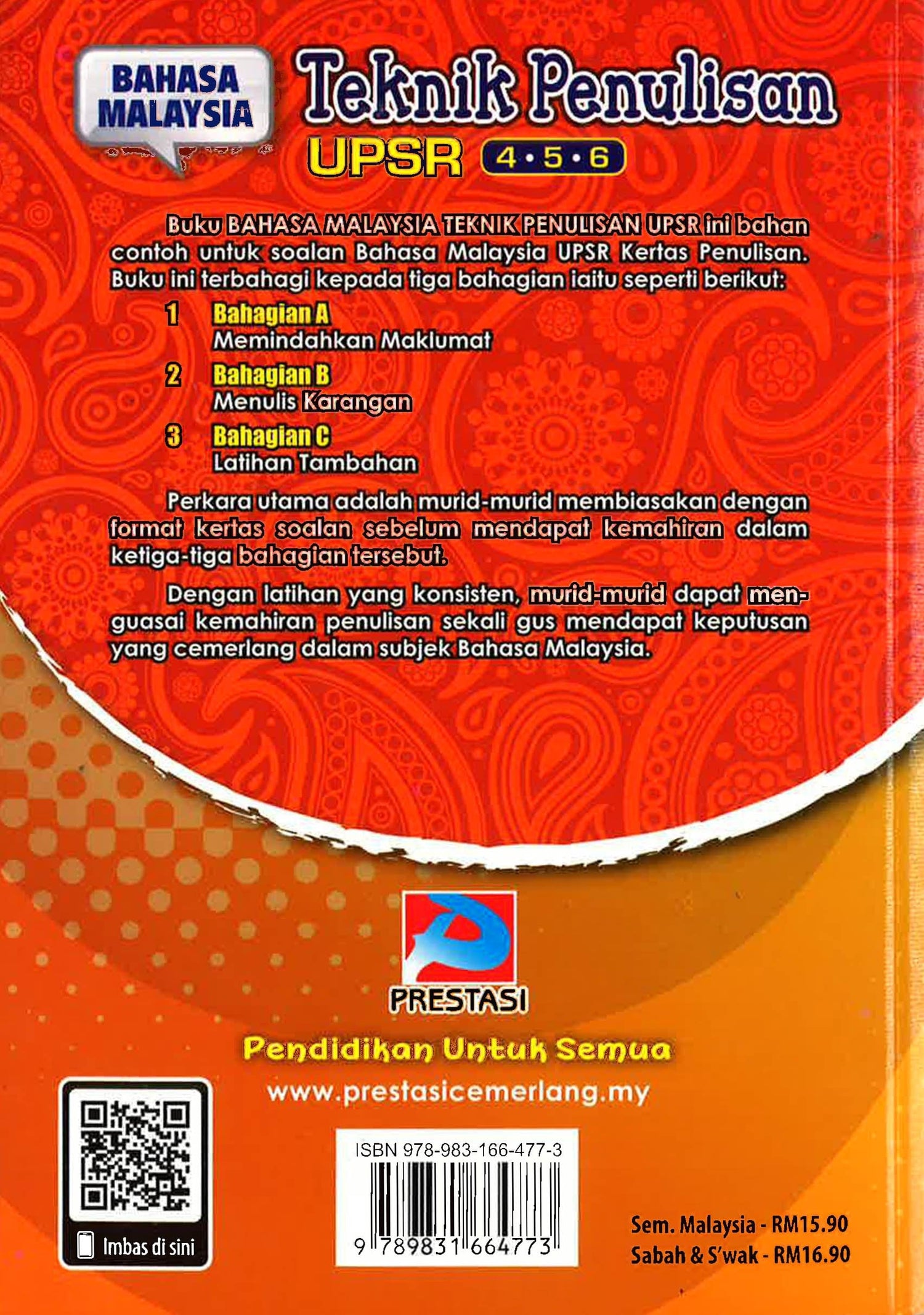 - Sesuai untuk murid tahun 4,5 & 6. - Format kertas penulisan UPSR terkini. - Menyediakan murid untuk peperiksaan UPSR. - Mempunyai tiga bahagian iaitu: 1) Bahagian A-Memindahkan Maklumat 2) Bahagian B-Menulis Karangan 3) Bahagian C-Latihan Tambahan - 164 muka surat.