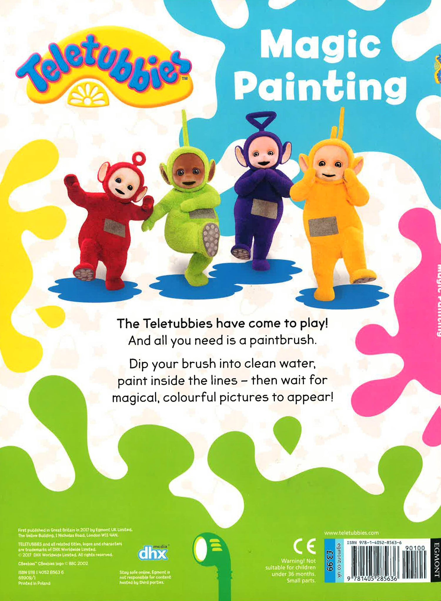 Join the Teletubbies in this magic painting book. Children ages 3, 4 and 5 will have hours of fun creating perfect pictures of Po, Laa-Laa, Tinky Winky and Dipsy. All you need is water and a brush!