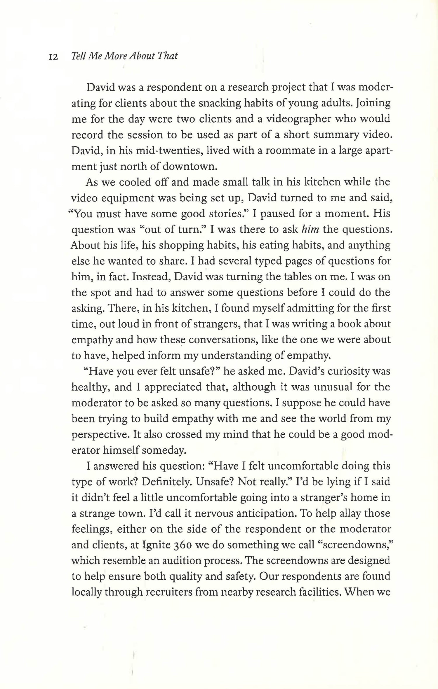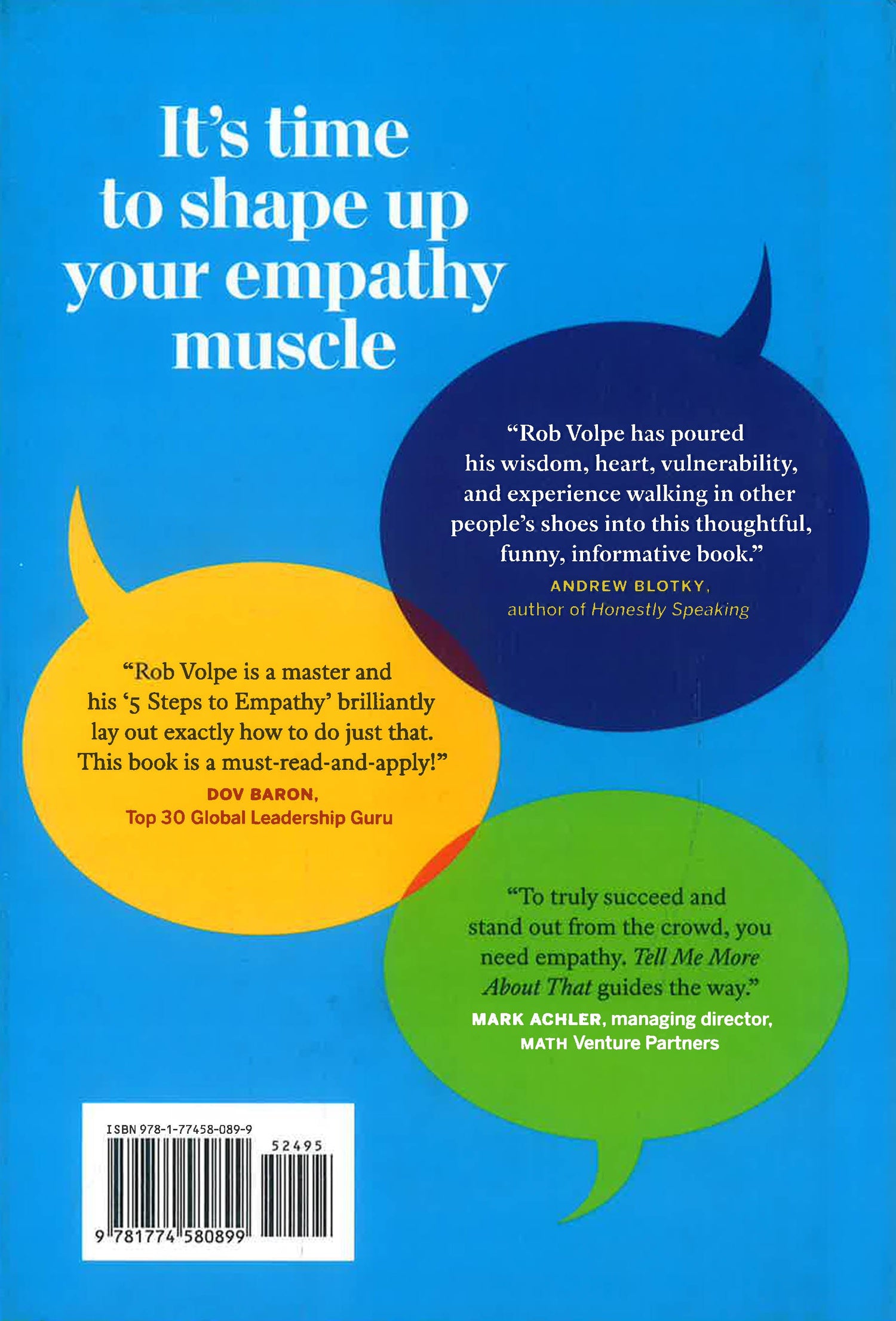 It's time to shape up your empathy muscle. Empathy is in short supply these days-and it's hurting us. From the rise in workplace bullying to increased anxiety and depression, a lack of empathy for one another is wearing away at the gears of society, grinding us down to the nubs. The very technology that is supposed to keep us connected is actually driving us apart, with face-to-face interactions on the decline, and news filtered through an echo chamber that shelters us from other points of view. But all is not lost. Just as physical workouts strengthen your body, there are ways to build up your empathy as well. In Tell Me More About That, brand strategist and thought leader Rob Volpe draws on his years conducting thousands of in-home interviews with everyday people to illustrate the 5 Steps to Empathy-the actions you can take to build a strong and reflexive empathy muscle. Through humorous and moving accounts of interactions with folks from every walk of life, Volpe recounts how, what often began in a stranger's house as a talk about brands and daily habits, could blossom at any minute into a conversation about family, relationships, hopes, and dreams. With empathy, we can all learn and understand more than we ever imagined possible.