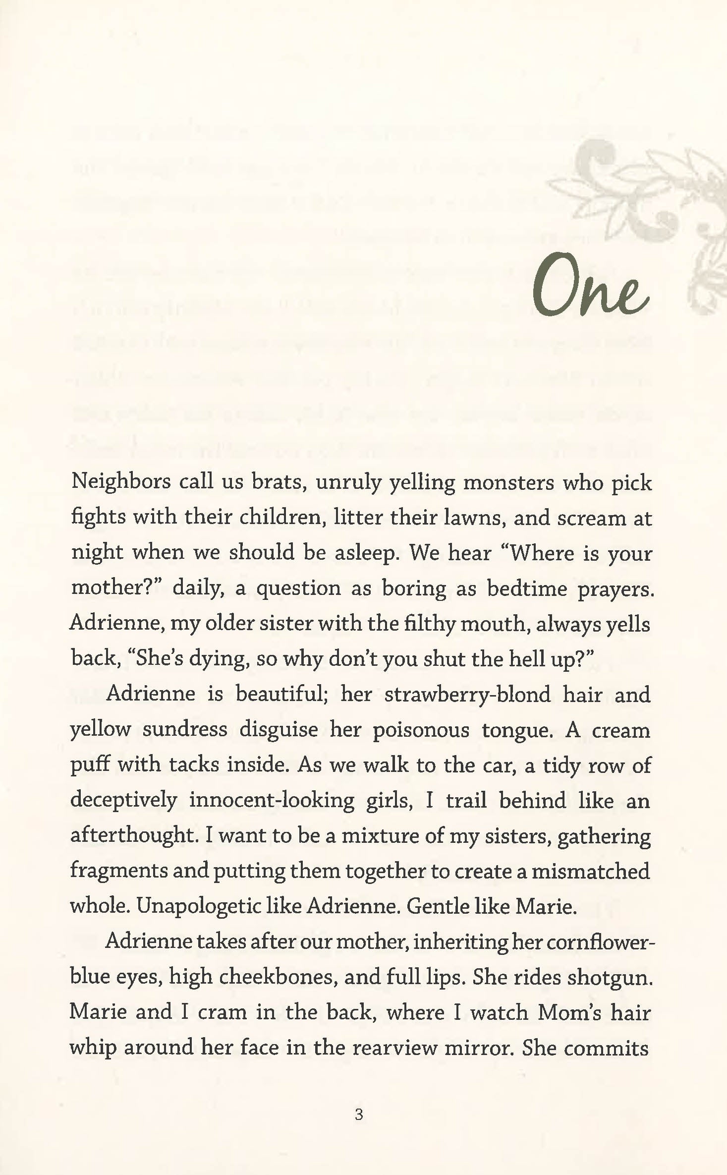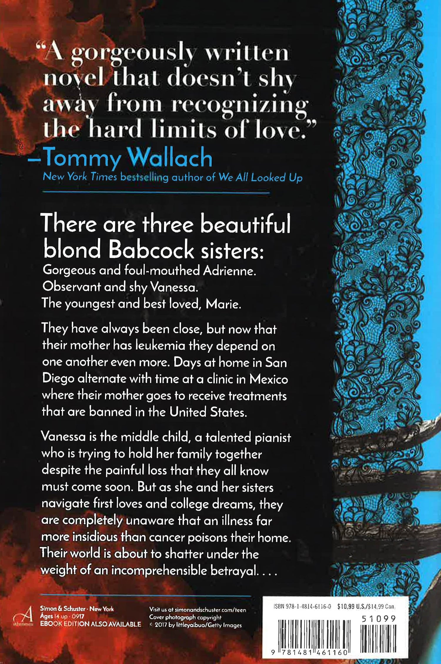 Three sisters struggle with the bonds that hold their family together as they face a darkness settling over their lives in this "one of a kind" (Kirkus Reviews, starred review) debut novel that's a finalist for the William C. Morris Award. There are three beautiful blond Babcock sisters: gorgeous and foul-mouthed Adrienne, observant and shy Vanessa, and the youngest and best-loved, Marie. Their mother is ill with leukemia and the girls spend a lot of time with her at a Mexican clinic across the border from their San Diego home so she can receive alternative treatments. Vanessa is the middle child, a talented pianist who is trying to hold her family together despite the painful loss that they all know is inevitable. As she and her sisters navigate first loves and college dreams, they are completely unaware that an illness far more insidious than cancer poisons their home. Their world is about to shatter under the weight of an incomprehensible betrayal...