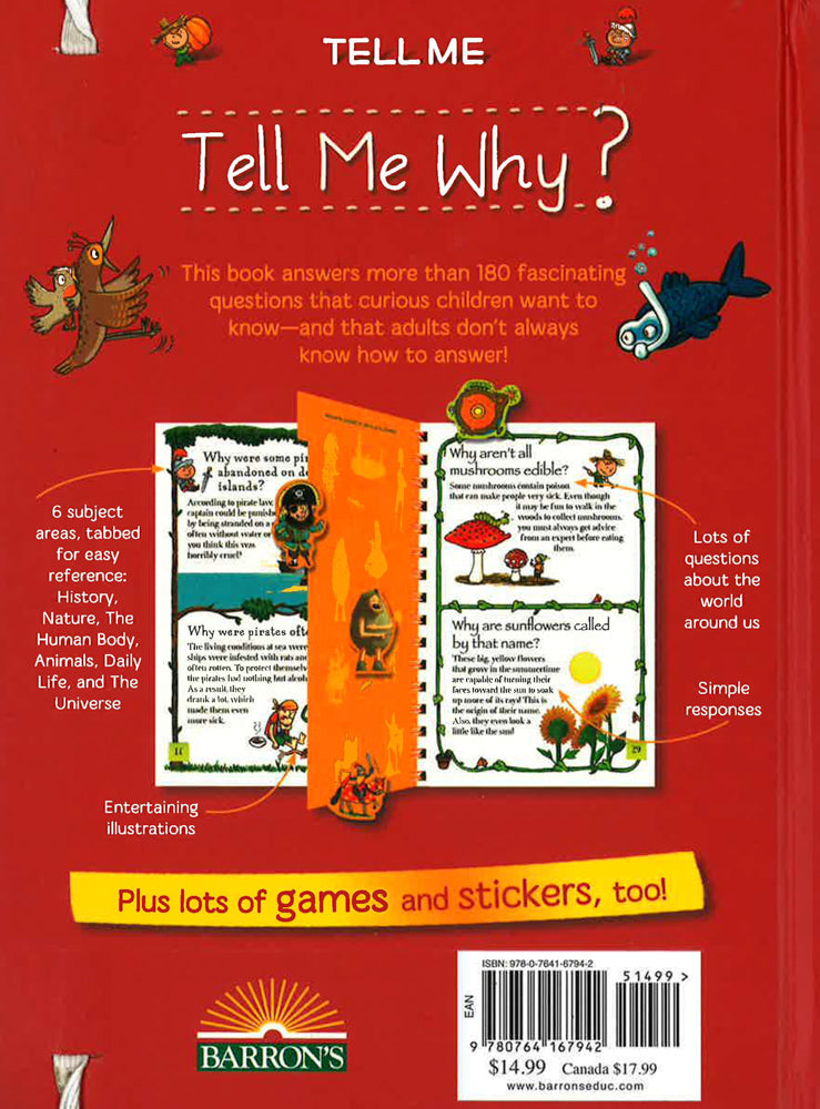 This fun-filled Q&A book is packed with answers to questions that curious children want to know--and parents are only too happy to give them the means to discover on their own. It contains more than 180 answers to questions about history, nature, the human body, animals, plants, the Earth, and more. In Tell Me Why?, kids can find the answers to questions such as: Why were some pirates abandoned on a desert island?, Why are there mummies?, and Why do we go to school? Organized according to different topics and tabbed for easy reference, this book also features a hidden spiral binding that makes it easy to flip back and forth. Entertaining illustrations, cool stickers, and activity sections make learning more fun than ever.