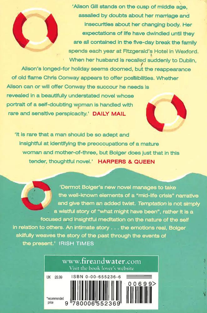 A marriage and a family reach breaking point on an annual holiday in the loveliest hotel in Ireland. Dermot Bolger is one of the leading figures on the Irish literary scene. Very influential, amazingly energetic and prolific, popular and extremely well respected. Dermot writes fast-paced, incredibly readable novels, usually with a thriller element, always about Ireland, more often than not about its Troubles. `Temptation' is quite different. It is about family life. It describes five days in the lives of Alison, her husband Peadar and their three children, who are taking their annual holiday on the southeastern coast of Ireland. Each member of the family has his or her own hopes for the holiday and preoccupations about the lives they are briefly leaving behind. The holiday serves as a turning point in their lives, as Alison and Peadar's marriage is put to the test and the vulnerabilities of their children are brought to the fore. Previous novels have always featured a female central character, and Dermot seems to love writing from a female perspective - and very good he is at it too. This new novel takes this strength and makes the most of it. Paciness and great readability are packed in there too.