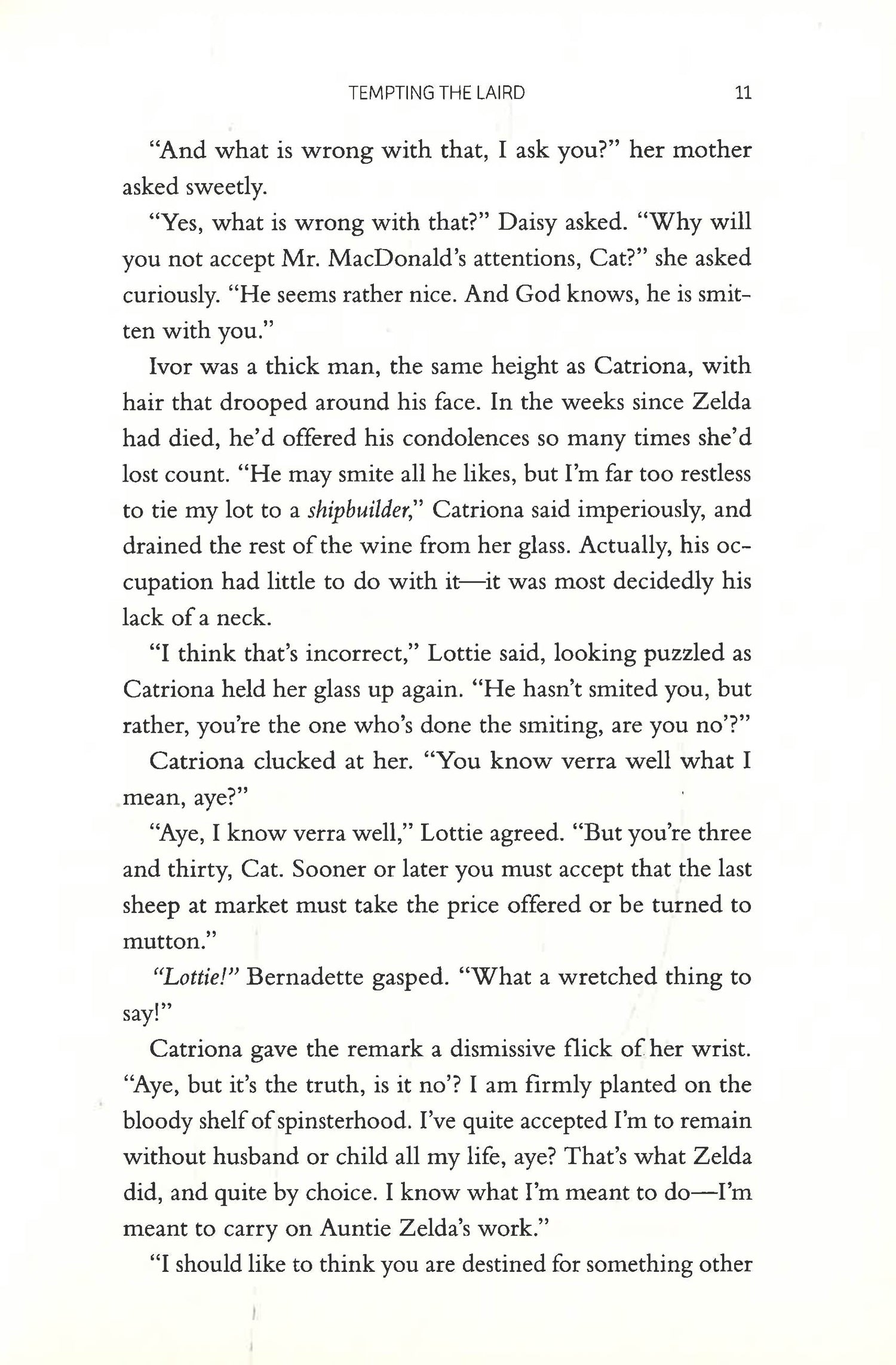 Unruly. Unmarried. Unapologetic. Catriona Mackenzie’s reputation precedes her everywhere she goes. Her beloved late aunt Zelda taught Cat to live out loud and speak her mind, and that’s exactly what she does when Zelda’s legacy—a refuge for women in need—comes under fire. When her quest puts her in the path of the disturbingly mysterious Hamlin Graham, Duke of Montrose, Cat is soon caught up in the provocative rumors surrounding the dark duke. Never one to retreat, Cat boldly goes where no one else has dared for answers.