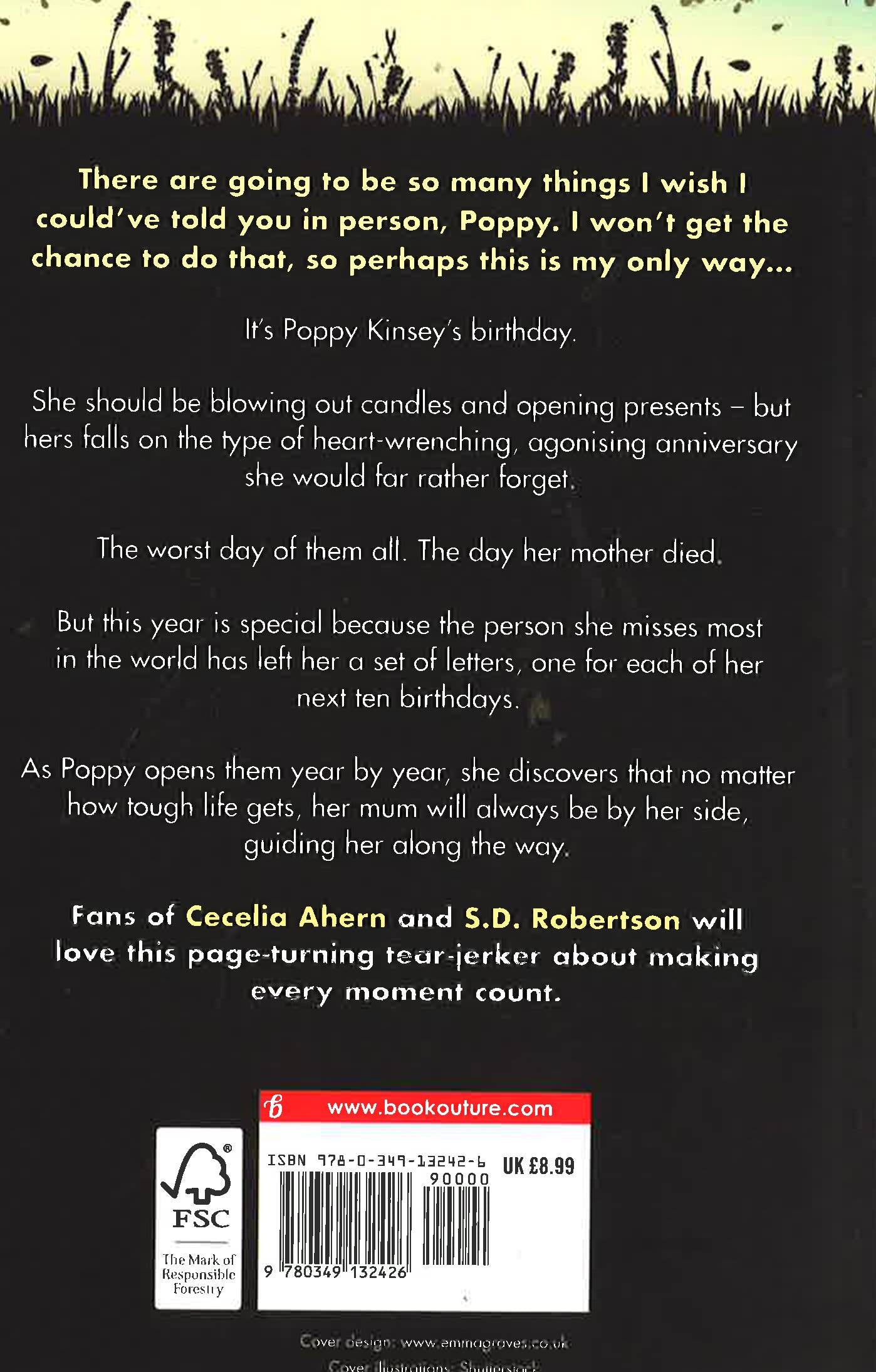 It's Poppy Kinsey's birthday. She should be blowing out candles and opening presents - but hers falls on the type of heart-wrenching, agonising anniversary she would far rather forget. The worst day of them all. The day her mother died. But this year is special because the person she misses most in the world has left her a set of letters, one for each of her next ten birthdays. As Poppy opens them year by year, she discovers that no matter how tough life gets, her mum will always be by her side, guiding her along the way. Fans of Cecelia Ahern and S.D. Robertson will love this page turning tear-jerker about making every moment count.