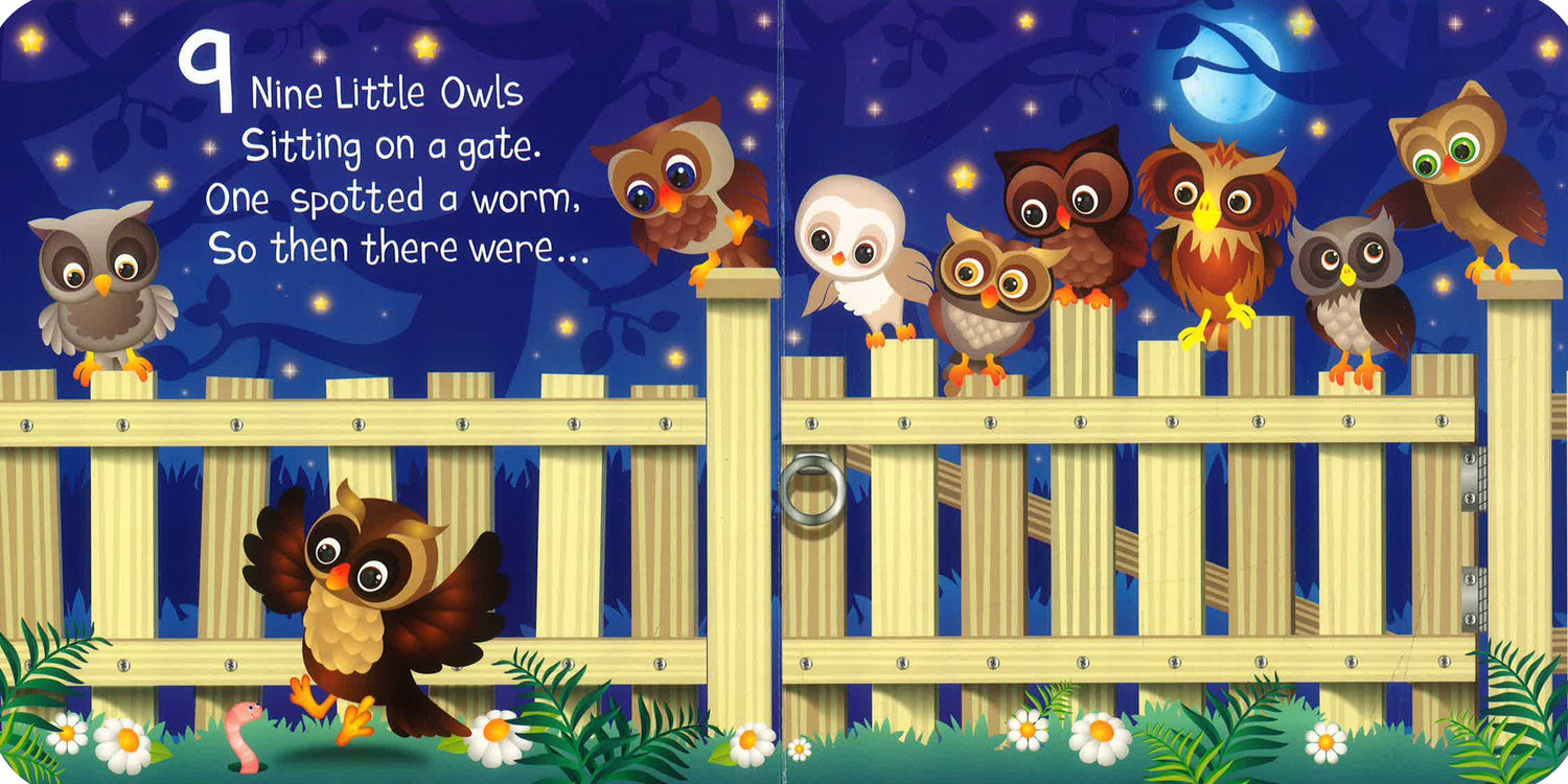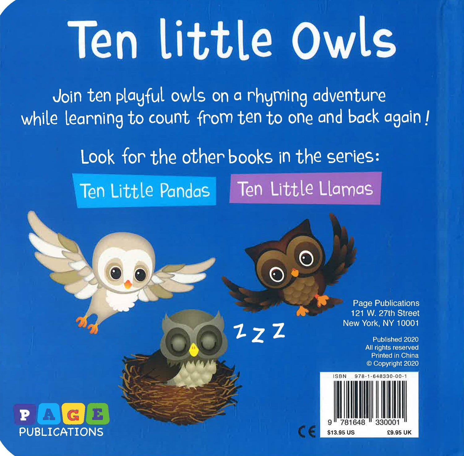 Join Ten playful owls on a rhyming adventure while learning to count from ten to one and back again! Look for other books in the series: Ten Little pandas and Ten little llamas.