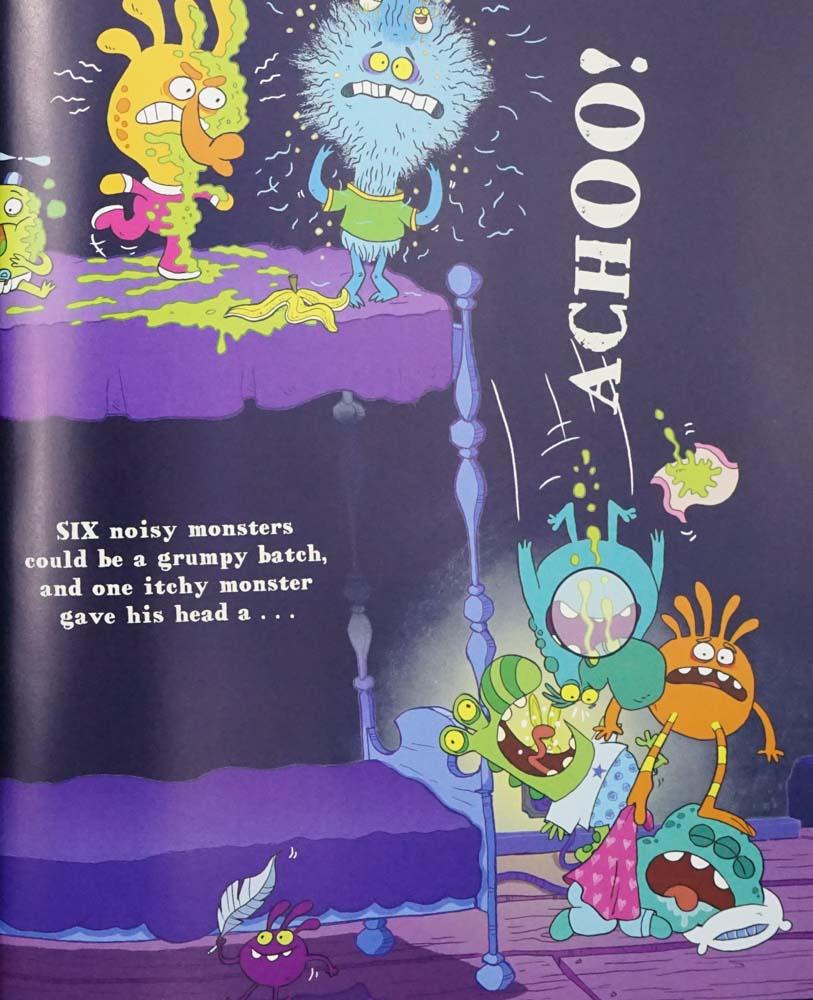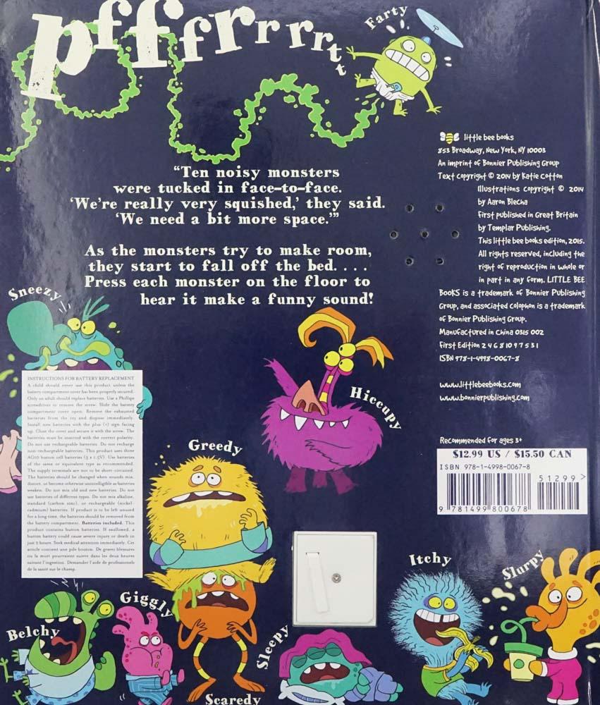 A monstrous play on "Ten Little Monkeys," this hilarious novelty book includes sound bites that can be played on each page. In this play on "Ten Little Monkeys," ten monsters are very squished on a bunk bed. On each spread, one monster gets pushed out onto the floor, and readers can press them to hear the fun sounds they make, like snoring, scratching, burping, and slurping. Eventually, all the monsters end up on the floor... and realize they're more squished than ever!