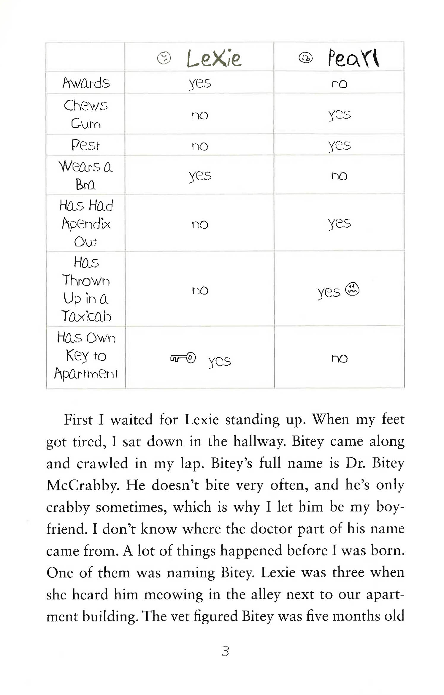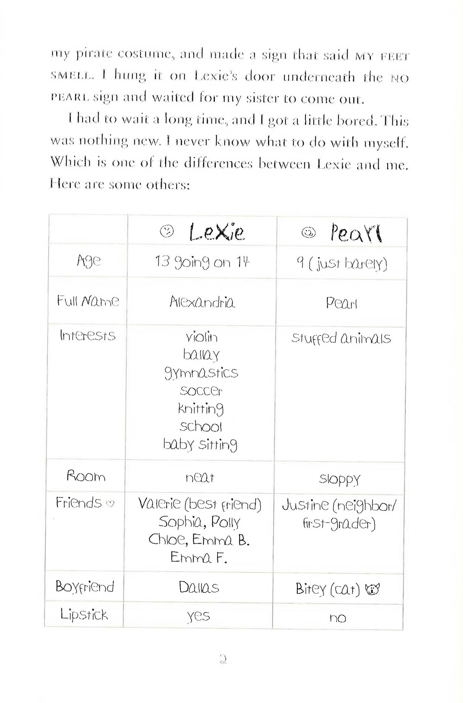 Pearl's older sister Lexie is in eighth grade and has a boyfriend. Pearl's only boyfriend is the family's crabby cat, Bitey. Lexie is popular. Pearl is not, mostly because of the embarrassing Three Bad Things that happened in school and which no one has forgotten. Everything Pearl does seems to drive Lexie crazy. On top of that, their grandfather is moving into their family's apartment and taking over Pearl's room. How will these sisters share without driving one another crazy? Pearl is good at making lists of rules, but sometimes, life doesn't play by the rules!