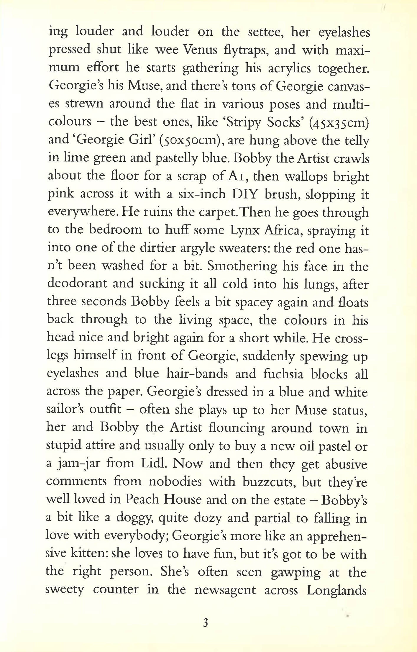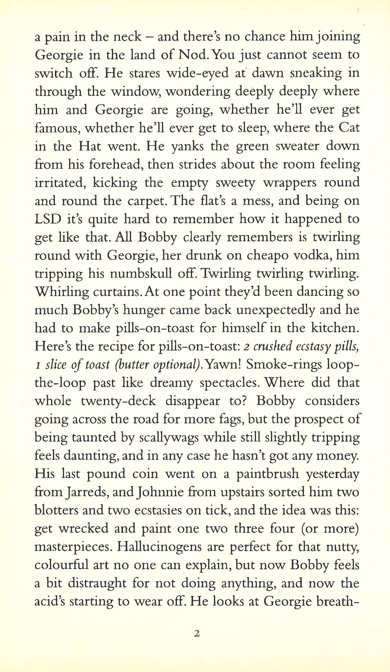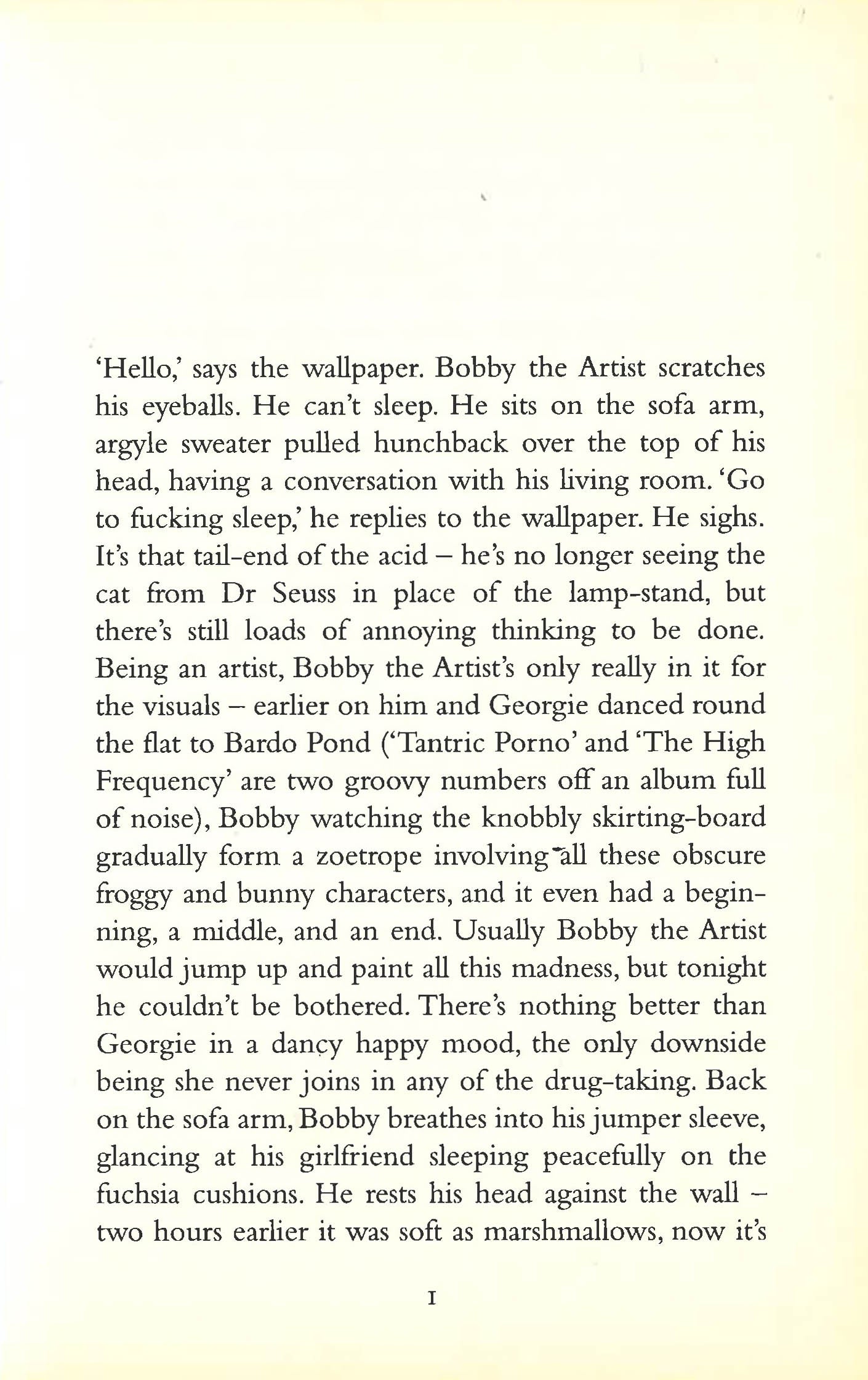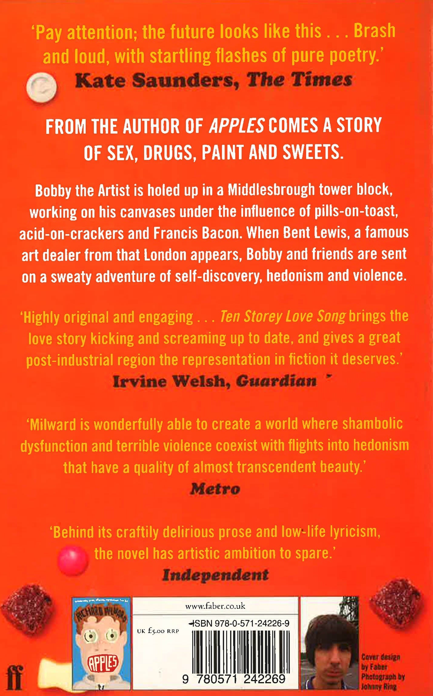 Bobby, holed up in a Middlesbrough tower block, works on his paintings under the influence of pills-on-toast, acid-on-crackers and Francis Bacon. When Bent Lewis, a famous art dealer and mover-shaker from that London appears, Bobby and friends are sent on a sweaty adventure of self-discovery, hedonism and violence involving a 2.5cm-head curved claw hammer. Spanning one dynamite paragraph, Ten Storey Love Song is a ferocious slab of concrete prose peppered with beauty and delivered with glorious abandon.