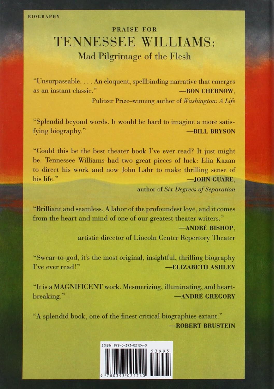Tennessee Williams: Mad Pilgrimage of the FleshTennessee Williams: Mad Pilgrimage of the FleshA Streetcar Named DesireThe Glass MenagerieCat on a Hot Tin RoofThe portrait of Williams himself is unforgettable: a virgin until he was twenty-six, he had serial homosexual affairs thereafter as well as long-time, bruising relationships with Pancho Gonzalez and Frank Merlo. With compassion and verve, Lahr explores how Williams's relationships informed his work and how the resulting success brought turmoil to his personal life.Lahr captures not just Williams's tempestuous public persona but also his backstage life, where his agent Audrey Wood and the director Elia Kazan play major roles, and Marlon Brando, Anna Magnani, Bette Davis, Maureen Stapleton, Diana Barrymore, and Tallulah Bankhead have scintillating walk-on parts. This is a biography of the highest order: a book about the major American playwright of his time written by the major American drama critic of his time.Chicago TribuneUSA TodayWashington Post