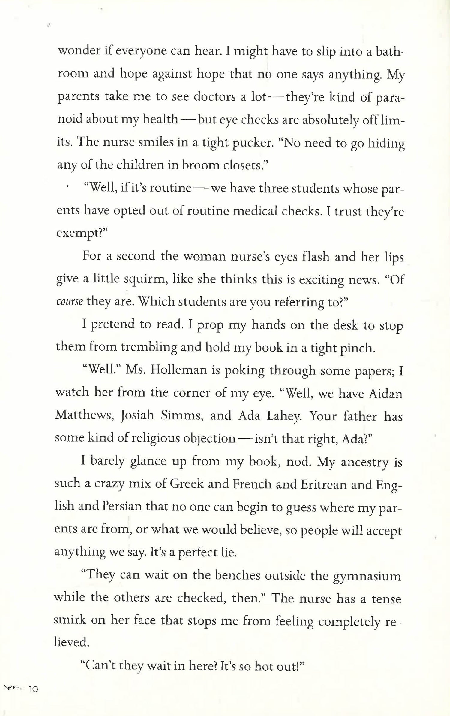 Twelve-year-old Ada is a Chimera, born with human and animal DNA thanks to a genetic experiment gone wrong. Because being a "kime" is believed to be contagious, she has kept her condition--complete with infrared vision--hidden. But a surprise test outs her, and Ada is shipped off to a quarantined school for kimes.