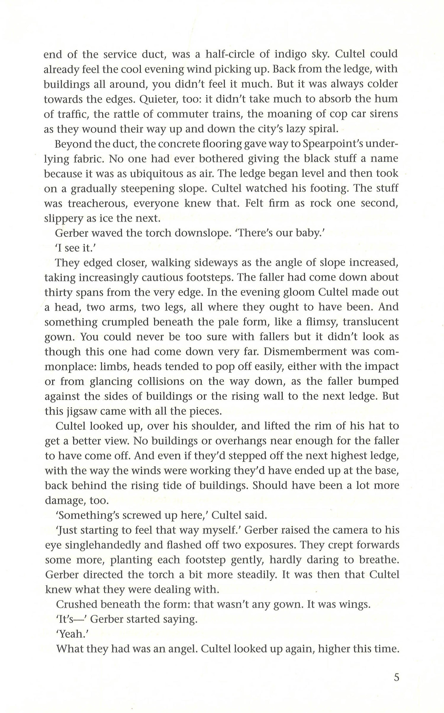 Spearpoint, the last human city, is an atmosphere-piercing spire of vast size. Clinging to its skin are the zones, a series of semi-autonomous city-states, each of which enjoys a different - and rigidly enforced - level of technology. Horsetown is pre-industrial; in Neon Heights they have television and electric trains ...Following an infiltration mission that went tragically wrong, Quillon has been living incognito, working as a pathologist in the district morgue. But when a near-dead angel drops onto his dissecting table, Quillon's world is wrenched apart one more time, for the angel is a winged posthuman from Spearpoint's Celestial Levels - and with the dying body comes bad news. If Quillon is to save his life, he must leave his home and journey into the cold and hostile lands beyond Spearpoint's base, starting an exile that will take him further than he could ever imagine. But there is far more at stake than just Quillon's own survival, for the limiting technologies of the zones are determined not by governments or police, but by the very nature of reality - and reality itself is showing worrying signs of instability ...
