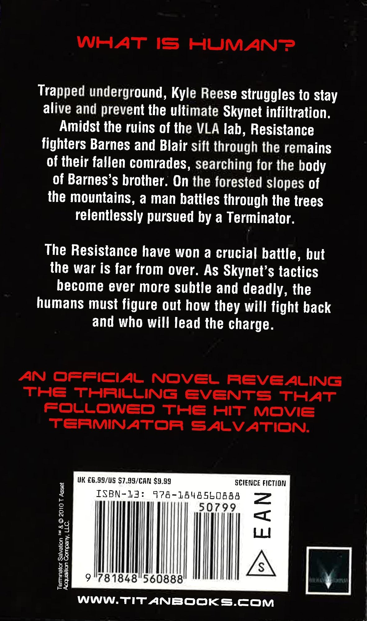 Following the dramatic events in "Terminator Salvation", a recovering John Connor grants The fourth Terminator movie, Terminator Salvation, starring Christian Bale and directed by McG was a summer box office hit, grossing over $400 million worldwide. In this brand new spin-off novel which follows on from events in the movie, a recovering John Connor grants Barnes permission to return to the destroyed VLA lab and bury his brother who was killed in the explosive opening of the movie. At the ruins Barnes and pilot Blair Williams search through the debris for the remains of their comrade. During their hunt they uncover a half-buried cable, that was clearly a data transmission line, leading up into the mountains. The two Resistance fighters head northwest to investigate. Amid the forests on the slopes of the mountains, the pair uncover an entire village that appears to have been largely untouched by Judgment Day and its aftermath. Suspicious of the villagers, Barnes and Blair decide to dig deeper.
