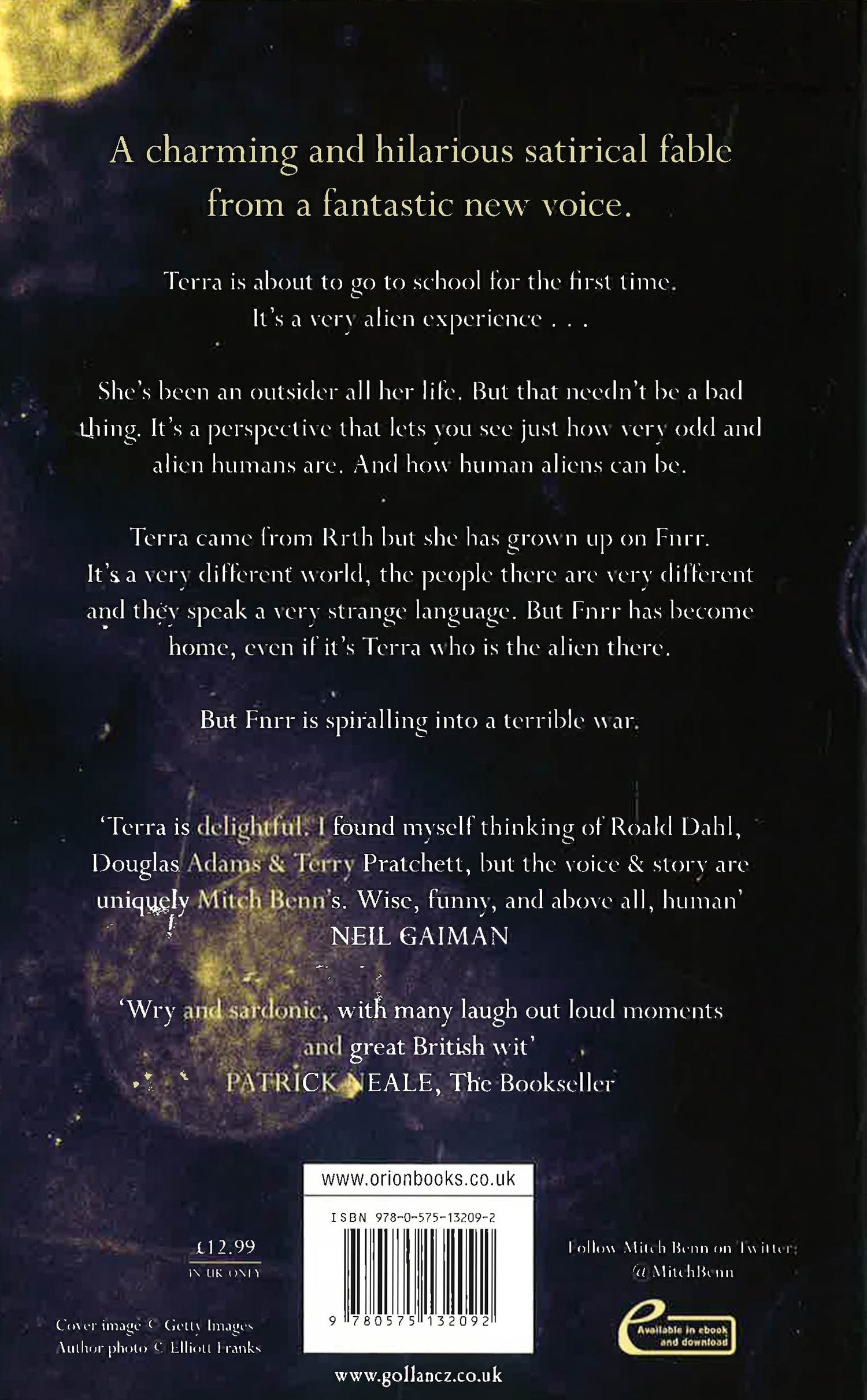 No-one trusts humanity. No-one can quite understand why we're intent on destroying the only place we have to live in the Universe. No-one thinks we're worth a second thought. And certainly no-one is about to let us get off Rrth. That would be a complete disaster. But one alien thinks Rrth is worth looking at. Not humanity, obviously, we're appalling, but until we manage to kill every other living thing on the planet there are some truly wonderful places on Rrth and some wonderful creatures living in them. Best take a look while they're still there. But on one trip to Rrth our alien biologist causes a horrendous accident. The occupants of a car traveling down a lonely road spot his ship (the sort of massive lemon coloured, lemon shaped starship that really shouldn't be hanging in the sky over a road). Understandably the Bradbury's crash (interrupting the latest in a constant procession of bitter rows). And in the wreckage of their car our alien discovers a baby girl. She needs rescuing. From the car. From Rrth. From her humanity. And now eleven years later a girl called Terra is about to go to school for the first time. It's a very alien experience ...Terra is a charming and hilarious satirical fable. A story about how odd and alien we are. And a story about how human odd aliens are. It tells the story of a girl who grows up in a very different world, who gains a unique perspective on our world and a unique perspective on her new home. A girl who can teach us and them a lot. A girl living in an extraordinary world that is spiraling into a terrible war. *This book may have remainder mark.