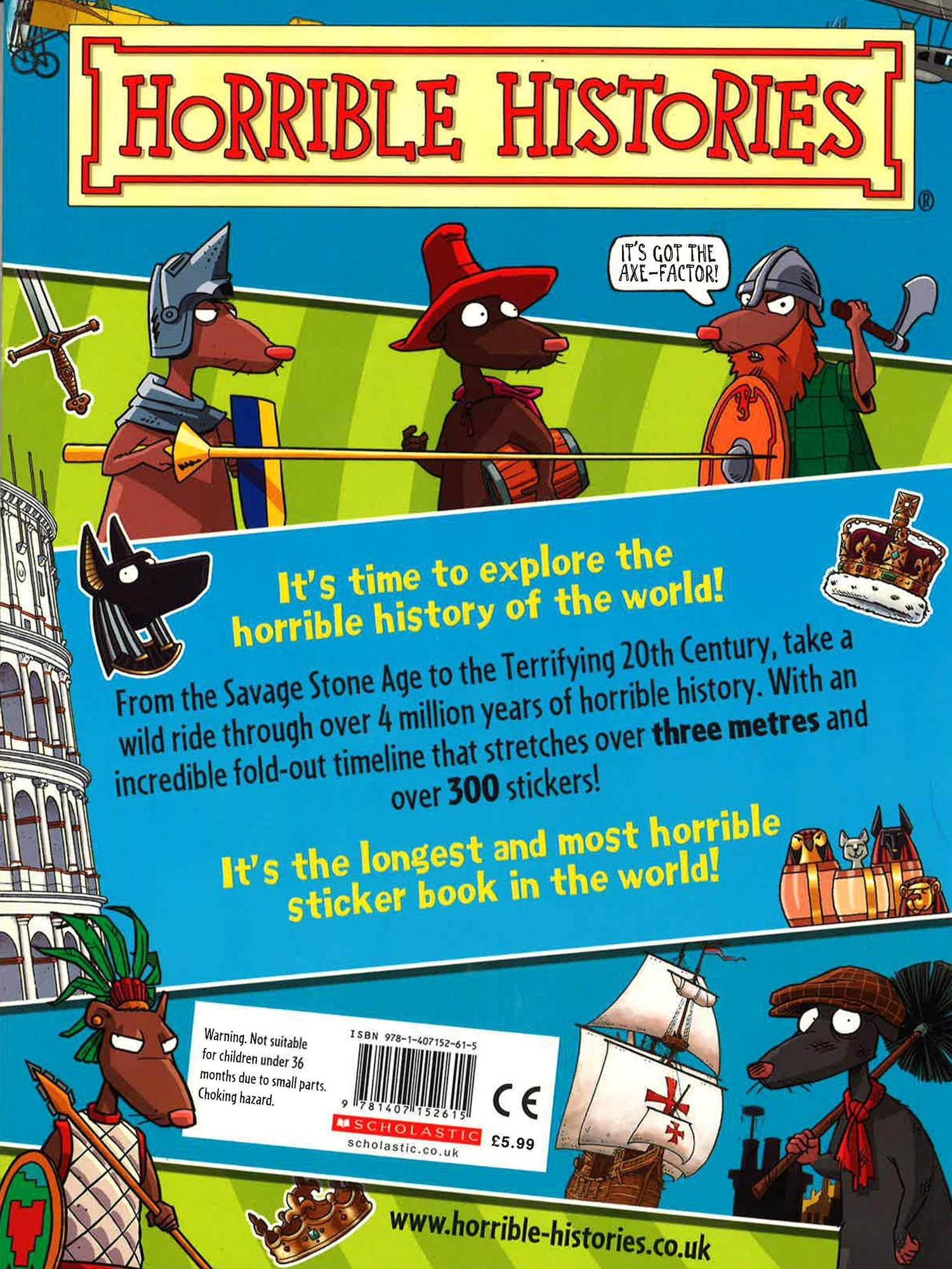 It's time to explore the horrible history of the world! From the Savage Stone Age to the Terrifying 20th Century, take a wild ride through over 4 million years of horrible history. With an incredible fold-out timeline that stretches over three metres and over 300 stickers! It's the longest and most horrible sticker book in the world! Part of a new series of HORRIBLE HISTORIES sticker activity books, crammed with foul facts and savage stickers.show more