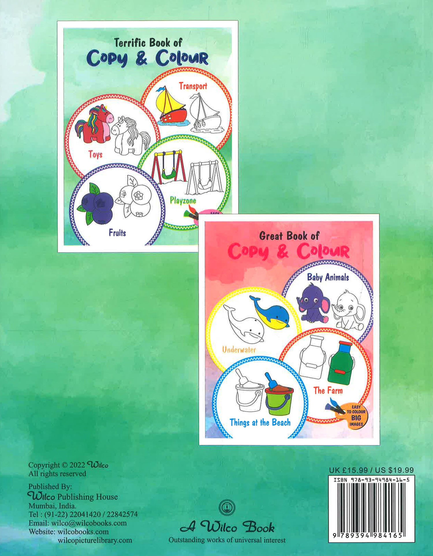 Colouring is fun. It promotes creativity, helps kids develop skills and even improves concentration. ‘Terrific Book of Copy & Colour’ includes topics:– Transport; Toys; Playzone; Fruits.