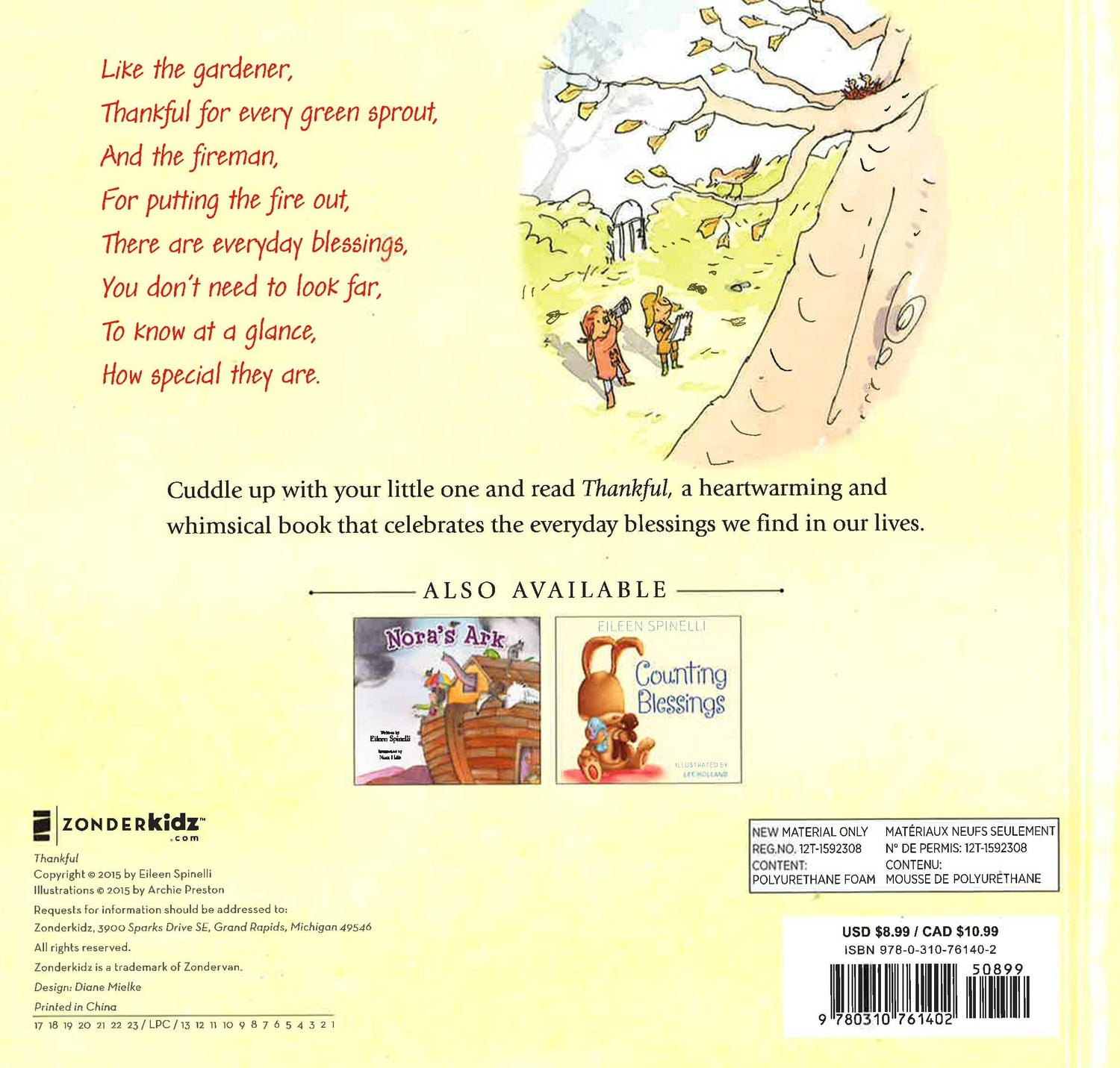Thankful, written by beloved children’s author Eileen Spinelli and illustrated by Archie Preston, combines charming rhymes and whimsical illustrations to convey the importance of being thankful for everyday blessings. Like the gardener thankful for every green sprout, and the firefighter, for putting the fire out, children are encouraged to be thankful for the many blessings they find in their lives. Spinelli exhibits her endearing gift for storytelling with this engaging poem, reminding children how blessed and special they are. Meant to be read aloud, this heartwarming board book will be a treasured keepsake for parents and children alike.