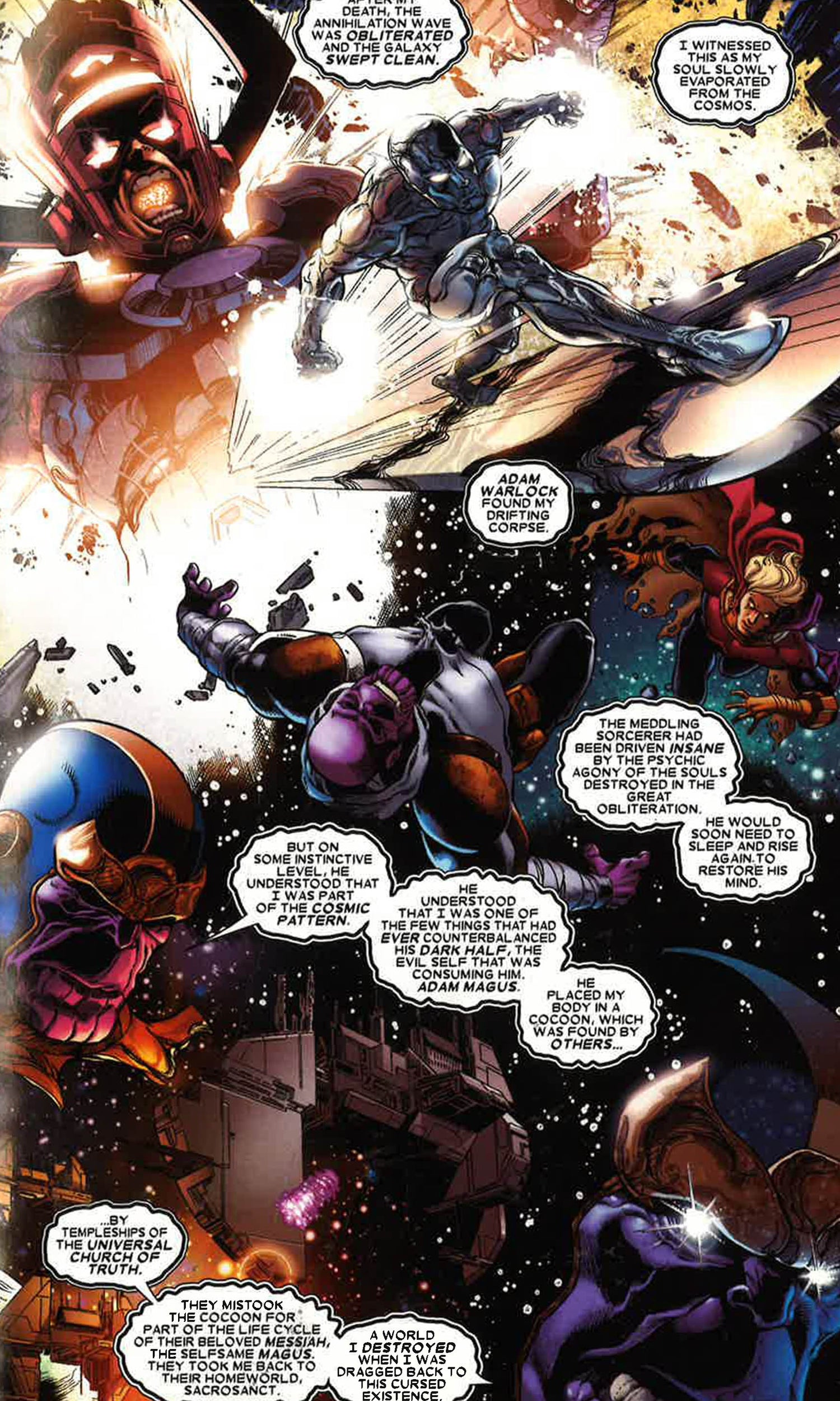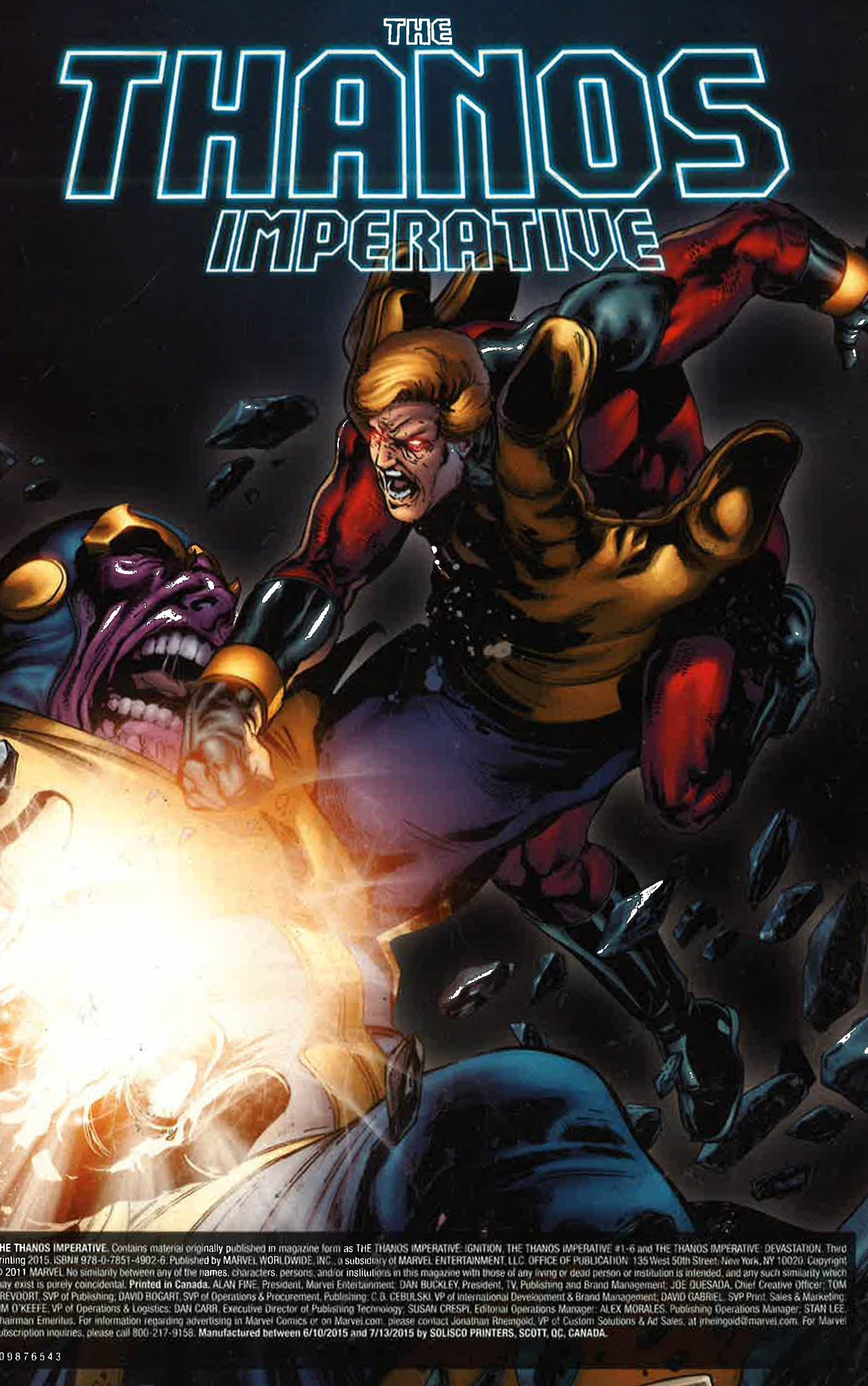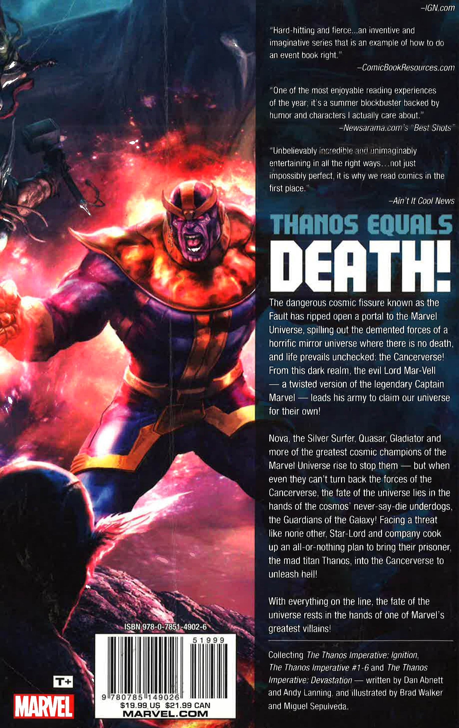 The dangerous cosmic fissure known as The Fault has ripped opened a portal to the Marvel Universe, spilling out the demented forces of a horrific mirror universe where there is no death and life prevails unchecked - the Cancerverse! From this dark realm, the evil Lord Mar-Vell - a twisted version of the legendary Captain Marvel - leads his army to claim our universe for their own! Nova, the Silver Surfer, Quasar, Gladiator and more of the greatest cosmic champions of the Marvel Universal rise to stop them, but when even they cannot stop the forces of the Cancerverse, the fate of the universe lies in the hands of the cosmos' never-say-die underdogs, the Guardians of the Galaxy! Facing a threat like none other, Star-Lord and company cook up an all-or-nothing plan to bring their prisoner, the mad titan Thanos, into the Cancerverse to unleash hell! With everything on the line, the fate of the universe rests in the hands of one of Marvel's greatest villains!