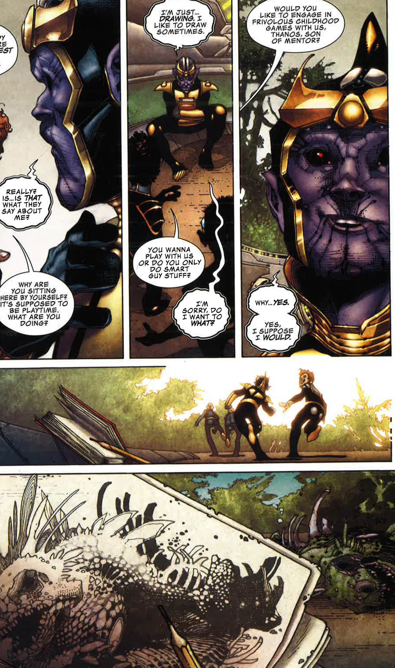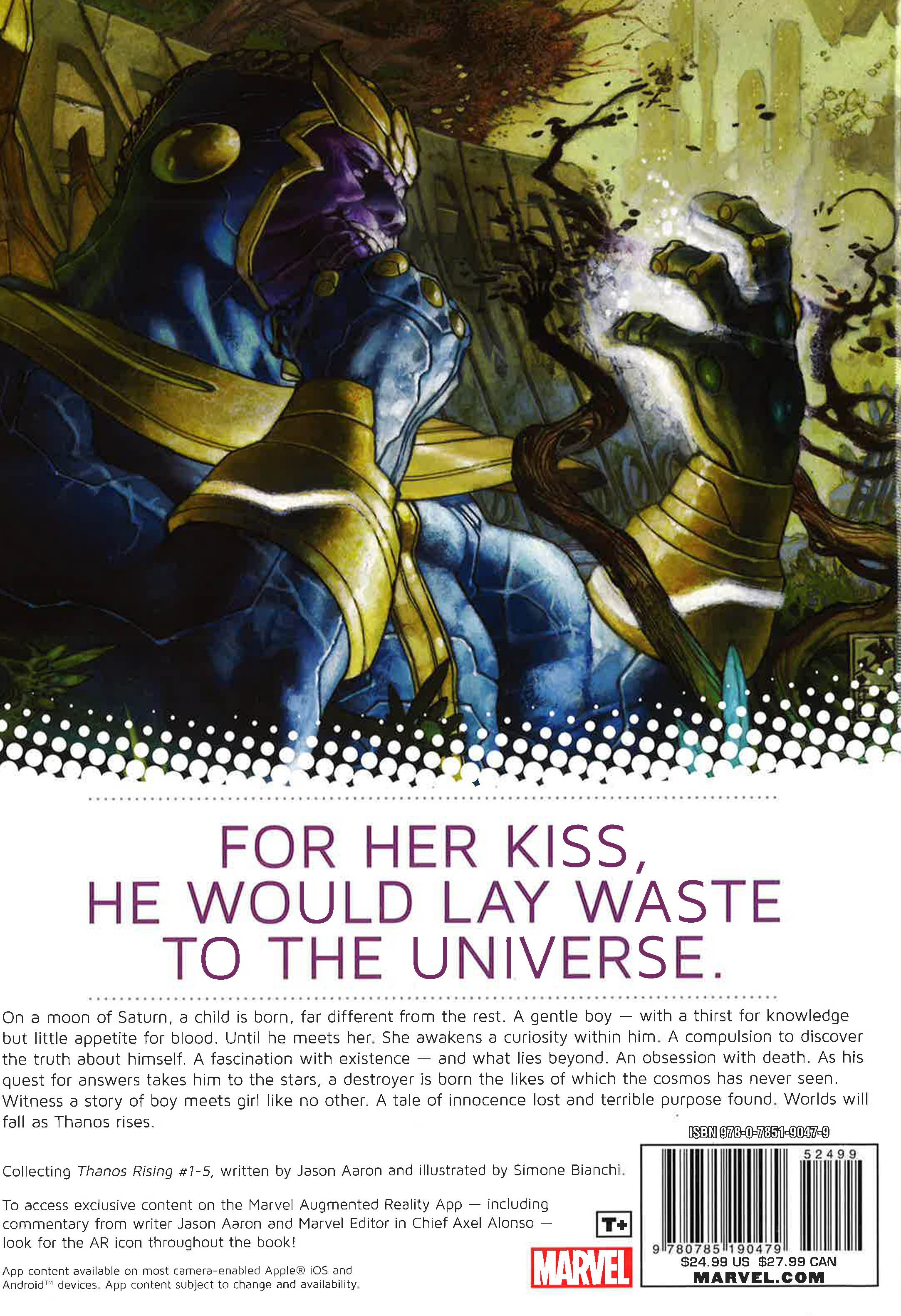 Witness the Mad Titan's dark origin! Thanos, scourge of the cosmos, rises to dominance as the unrivaled rogue of wretchedness in this gripping tale of tragedy, deceit and destiny! Where did this demi-god of death and destruction come from - and, more importantly, what does he want? True love begets a river of blood on the journey that will not only alter the course of one boy's life, but will soon change the face of the galaxy...and the very nature of the Marvel Universe!