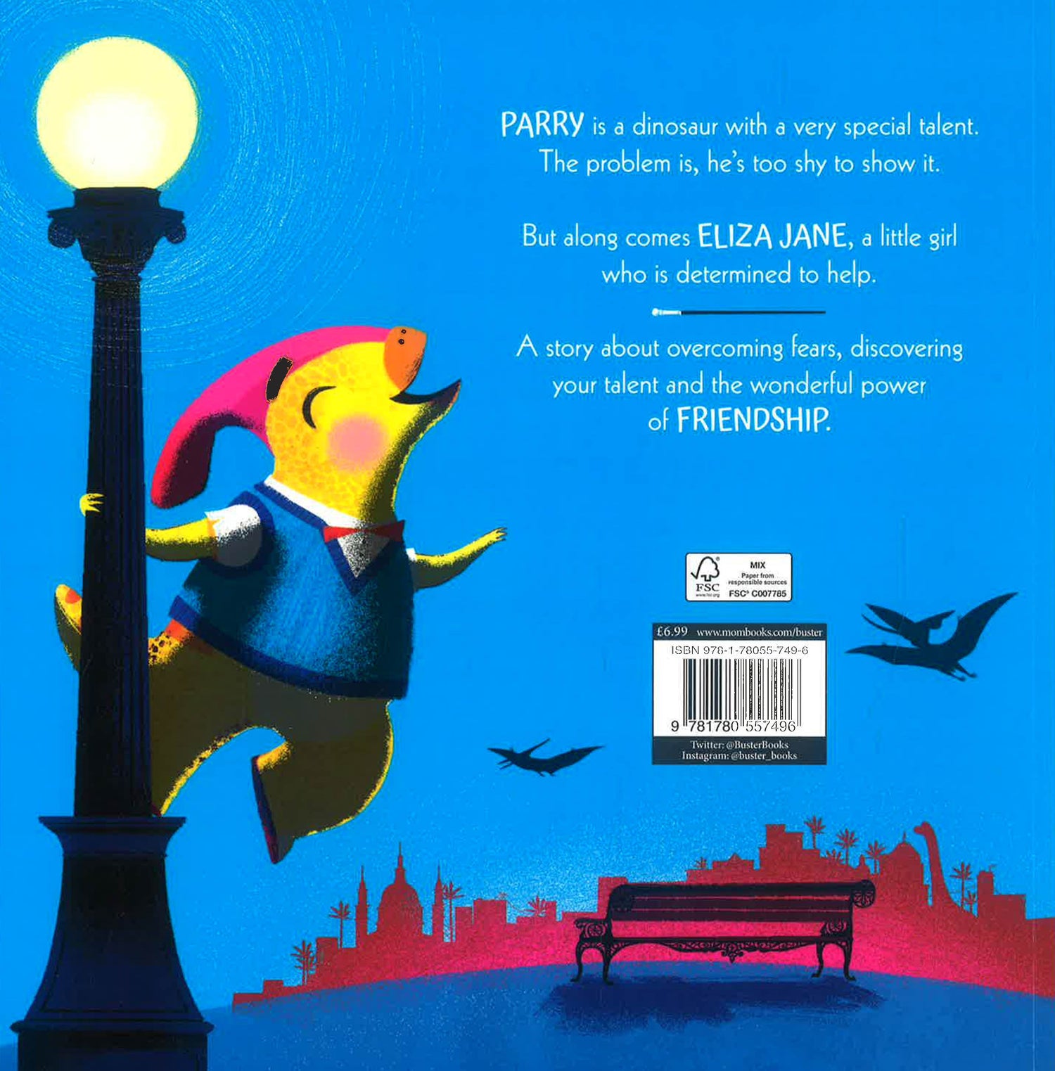 Eliza Jane lives in a town where dinosaurs and humans live happily side-by-side – raptors run restaurants, Troodons are teachers and you can even pay a visit to see a dinosaur dentist. Every dinosaur has a job to do, apart from one shy dino called Parry who always feels like he’s getting in the way. Eliza Jane is determined to help him find his groove but everything poor Parry tries seems to end in disaster. Then, one night, Eliza Jane discovers that Parry has a very special hidden talent and a star is born …