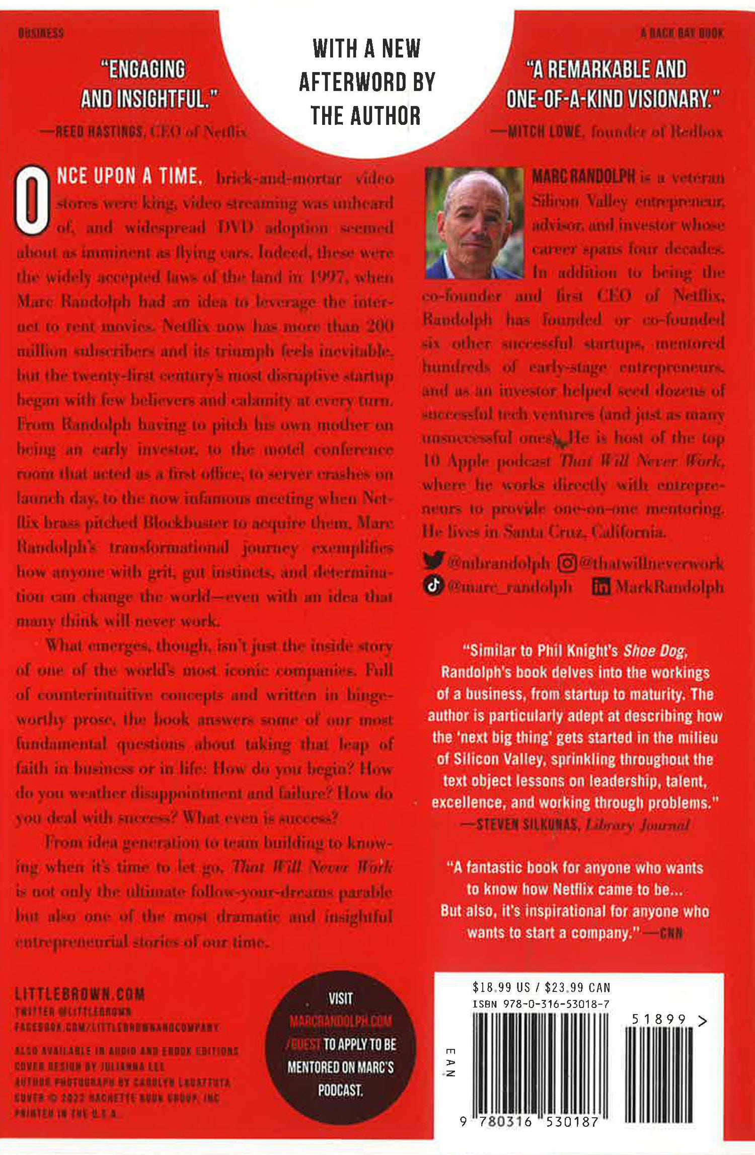 But Hastings was intrigued, and the pair--with Hastings as the primary investor and Randolph as the CEO--founded a company. Now with over 150 million subscribers, Netflix's triumph feels inevitable, but the twenty first century's most disruptive start up began with few believers and calamity at every turn. From having to pitch his own mother on being an early investor, to the motel conference room that served as a first office, to server crashes on launch day, to the now-infamous meeting when Netflix brass pitched Blockbuster to acquire them, Marc Randolph's transformational journey exemplifies how anyone with grit, gut instincts, and determination can change the world--even with an idea that many think will never work.
