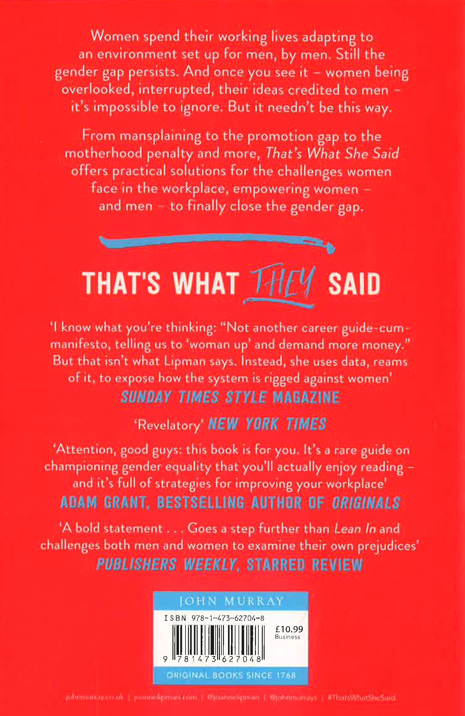 'I know what you're thinking: 'Not another career guide-cum-manifesto, telling us to "woman up" and demand more money.' But that isn't what Lipman says. Instead, she uses data, reams of it, to expose how the system is rigged against women. She then calls for men to join the fight to make the workplace more equal' SUNDAY TIMES STYLE MAGAZINE