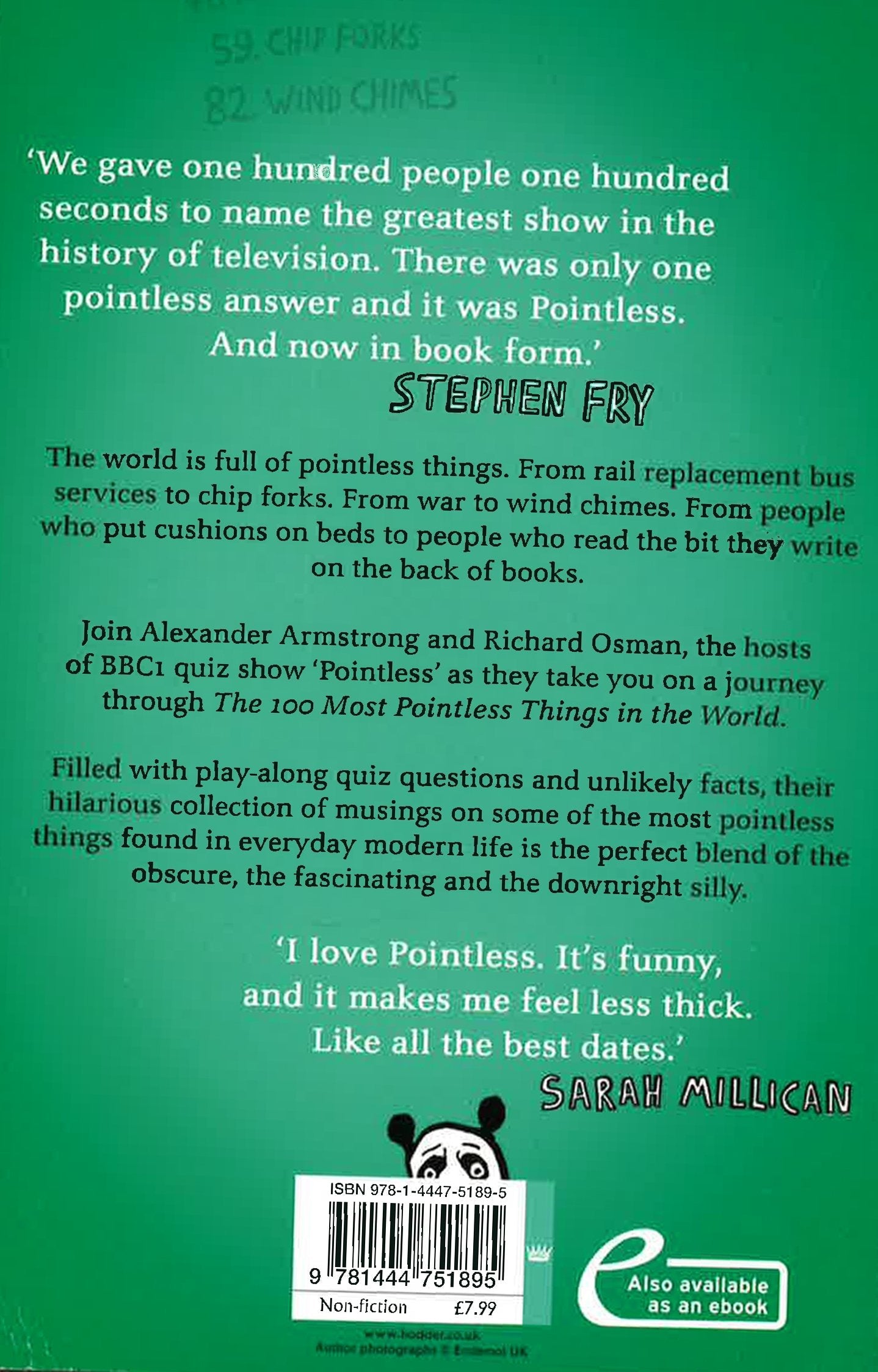 The world is full of pointless things. From rail replacement bus services to chip forks. From war to windchimes. From people who put cushions on beds to people who read the bit they write about the book on amazon. Look around you right now. See how many pointless things there are in just this one shop (or this one school playground if you've picked this up at a car boot fair)... Just about the only thing that isn't pointless is you. You look amazing. Join Alexander Armstrong and Richard Osman, the hosts of BBC1 quiz show Pointless as they take you on a journey through The 100 Most Pointless Things in the World. Filled with play-along quiz questions and unlikely facts, their hilarious collection of musings on some of the most pointless things found in everyday modern life is the perfect blend of the obscure, the fascinating and the downright silly.