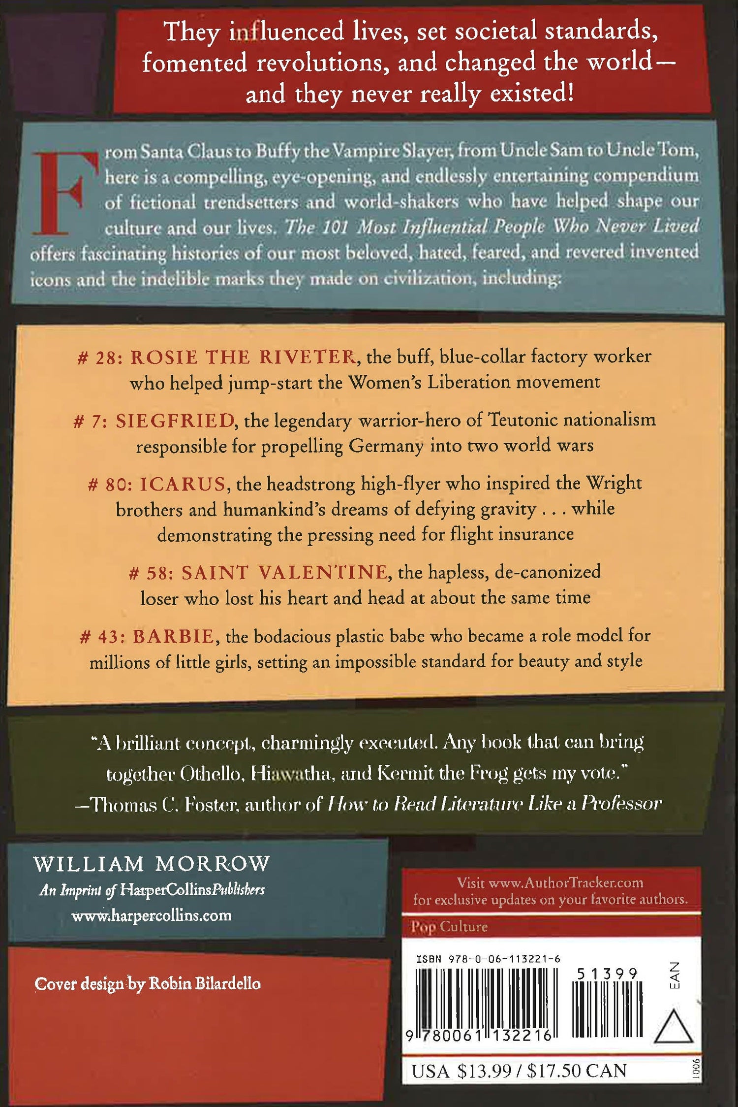 From Santa Claus to Buffy the Vampire Slayer, from Uncle Sam to Uncle Tom, here is a compelling, eye-opening, and endlessly entertaining compendium of fictional trendsetters and world-shakers who have helped shape our culture and our lives. The 101 Most Influential People Who Never Lived offers fascinating histories of our most beloved, hated, feared, and revered invented icons and the indelible marks they made on civilization, including: # 28: Rosie the Riveter, the buff, blue-collar factory worker who helped jump-start the Women's Liberation movement # 7: Siegfried, the legendary warrior-hero of Teutonic nationalism responsible for propelling Germany into two world wars # 80: Icarus, the headstrong high-flyer who inspired the Wright brothers and humankind's dreams of defying gravity ...while demonstrating the pressing need for flight insurance # 58: Saint Valentine, the hapless, de-canonized loser who lost his heart and head at about the same time # 43: Barbie, the bodacious plastic babe who became a role model for millions of little girls, setting an impossible standard for beauty and style