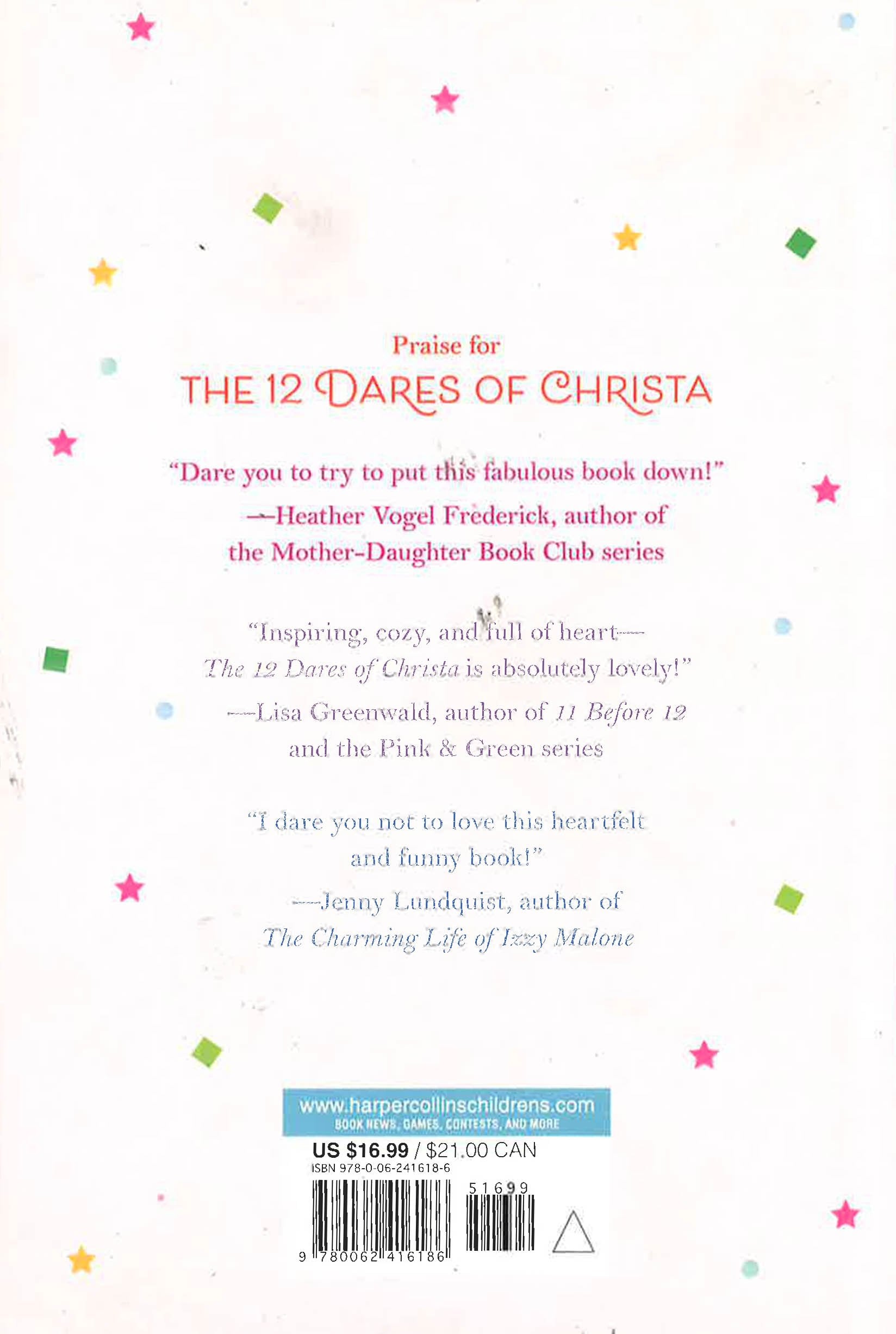 Christa is a holiday junkie. What’s not to love? There’s decorations! Gifts! Caroling with friends! But thanks to her parents’ recent separation, Christa’s favorite time of year is now filled with heartache. And when her mom announces that she’s taking her on a mother-daughter trip to Europe over winter vacation, Christa knows she should be excited. She just can’t imagine spending the yuletide season without her dad.However, waiting at her hotel in Italy is a special package from her father: the first of twelve dares that take Christa to landmarks in three beautiful countries and introduce her to people who will show her that hope is alive in the strangest of places. Funny, genuine, and feel-good to the core, The 12 Dares of Christa is one fa-la-la-filled adventure that fans of Wendy Mass and Lisa Greenwald will love.