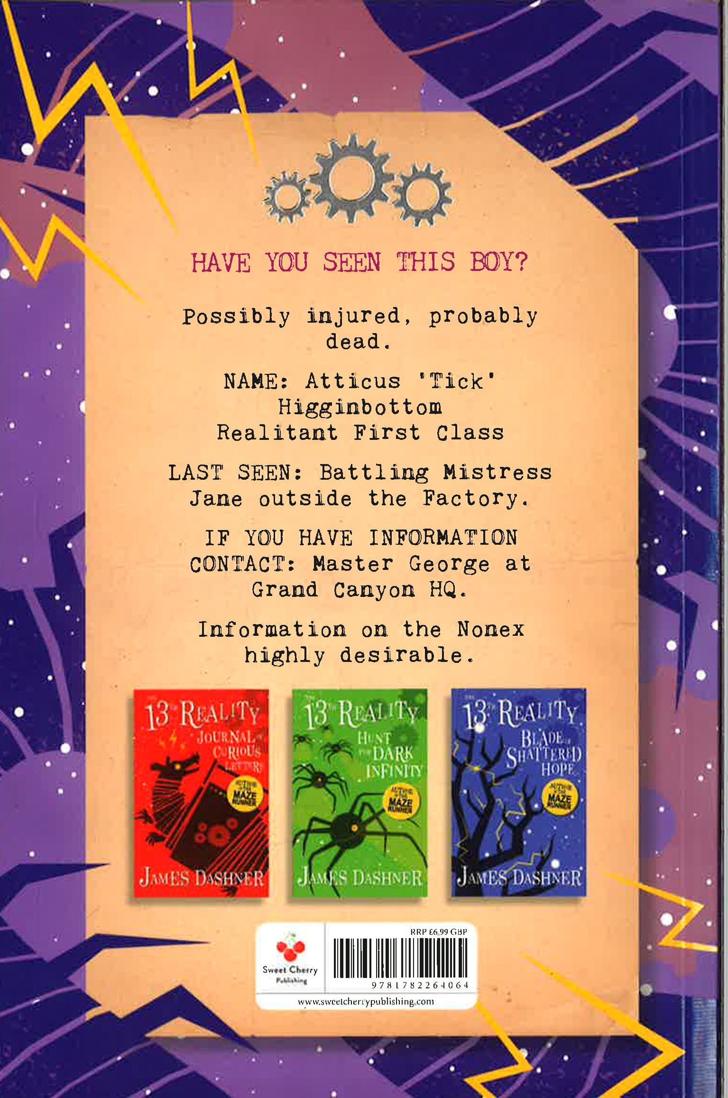 From the author of The Maze Runner, James Dashners' The 13th Reality series is an exciting adventure that crosses the boundaries of realities. Young readers will find this an enticing introduction to the fantasy genre. "HAVE YOU SEEN THIS BOY?Atticus 'Tick' HigginbottomRealitant First ClassLast seen battling Mistress Jane outside the Factory; possibly injured, probably dead. Family seeking information on his whereabouts. Contact Master George at Grand Canyon HQ or the Higginbottoms of Reality Prime if you know anything.Information on the Nonex also highly desirable."From the author of The Maze Runner, James Dashners' The 13th Reality series is an exciting adventure that crosses the boundaries of realities. Young readers will find this an enticing introduction to the fantasy genre.