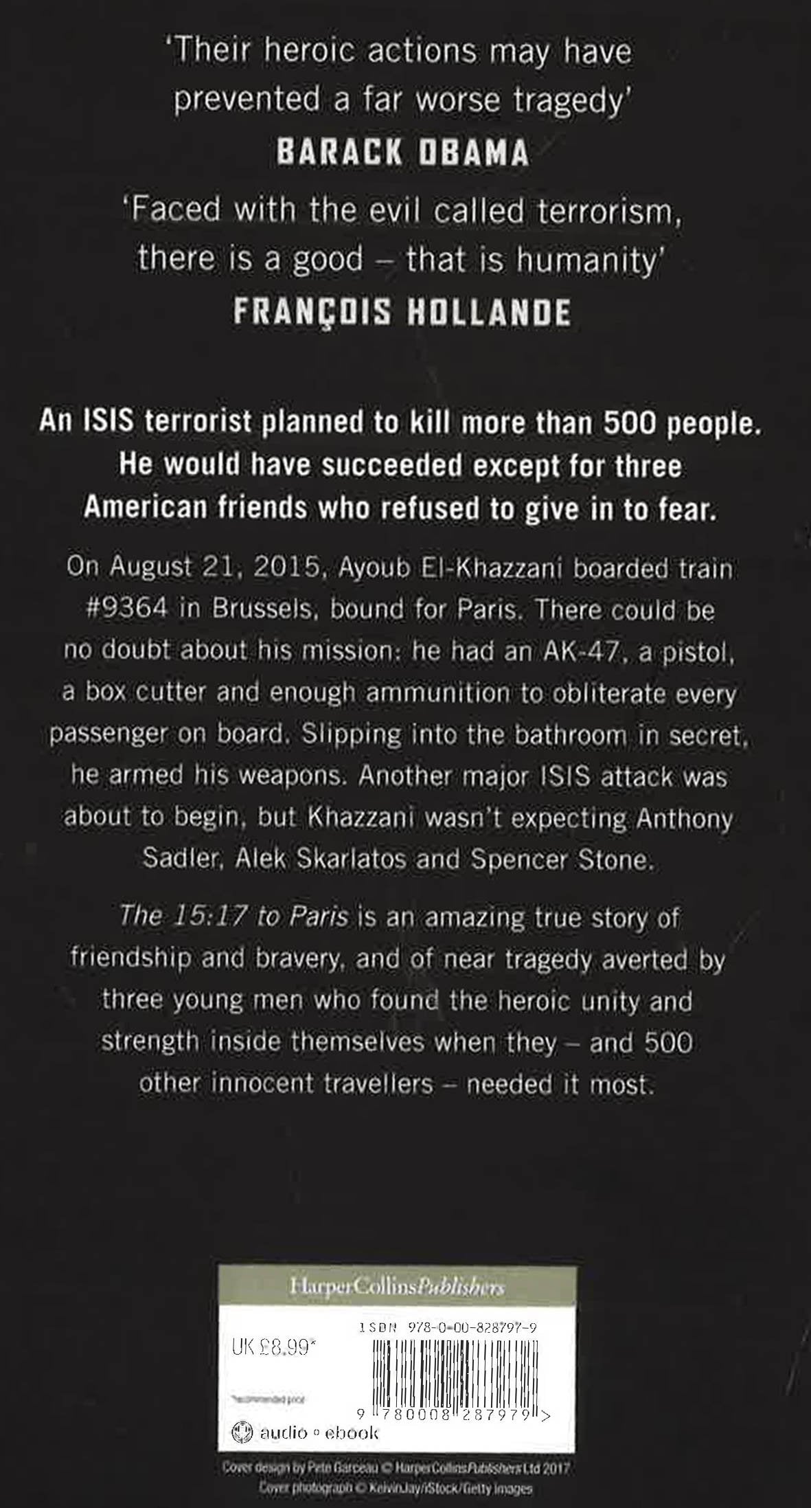 The 15:17 to Paris is the amazing true story of friendship and bravery, and of near tragedy averted by three heroic young men who found the unity and strength inside themselves when they - and 500 other innocent travellers - needed it most. On 21st August 2015, Ayoub El-Khazzani boarded train #9364 in Brussels, bound for Paris. There could be no doubt about his mission: he had an AK-47, a pistol, a box cutter and enough ammunition to obliterate every passenger on board. Slipping into the bathroom in secret, he armed his weapons. Another major ISIS attack was about to begin, but Khazzani wasn't expecting Anthony Sadler, Alek Skarlatos and Spencer Stone. Stone was a martial arts enthusiast and airman first class in the US Air Force, Skarlatos was a member of the Oregon National Guard, and all three were fearless. But their decision, to charge the gunman, then overpower him even as he turned first his gun, then his knife, on Stone, depended on a lifetime of loyalty, support, and faith. Their friendship was forged as they came of age together in California: going to church, playing paintball, teaching each other to swear, and sticking together when they got in trouble at school. Years later, that friendship would give all of them the courage to stand in the path of one of the world's deadliest terrorist organisations.