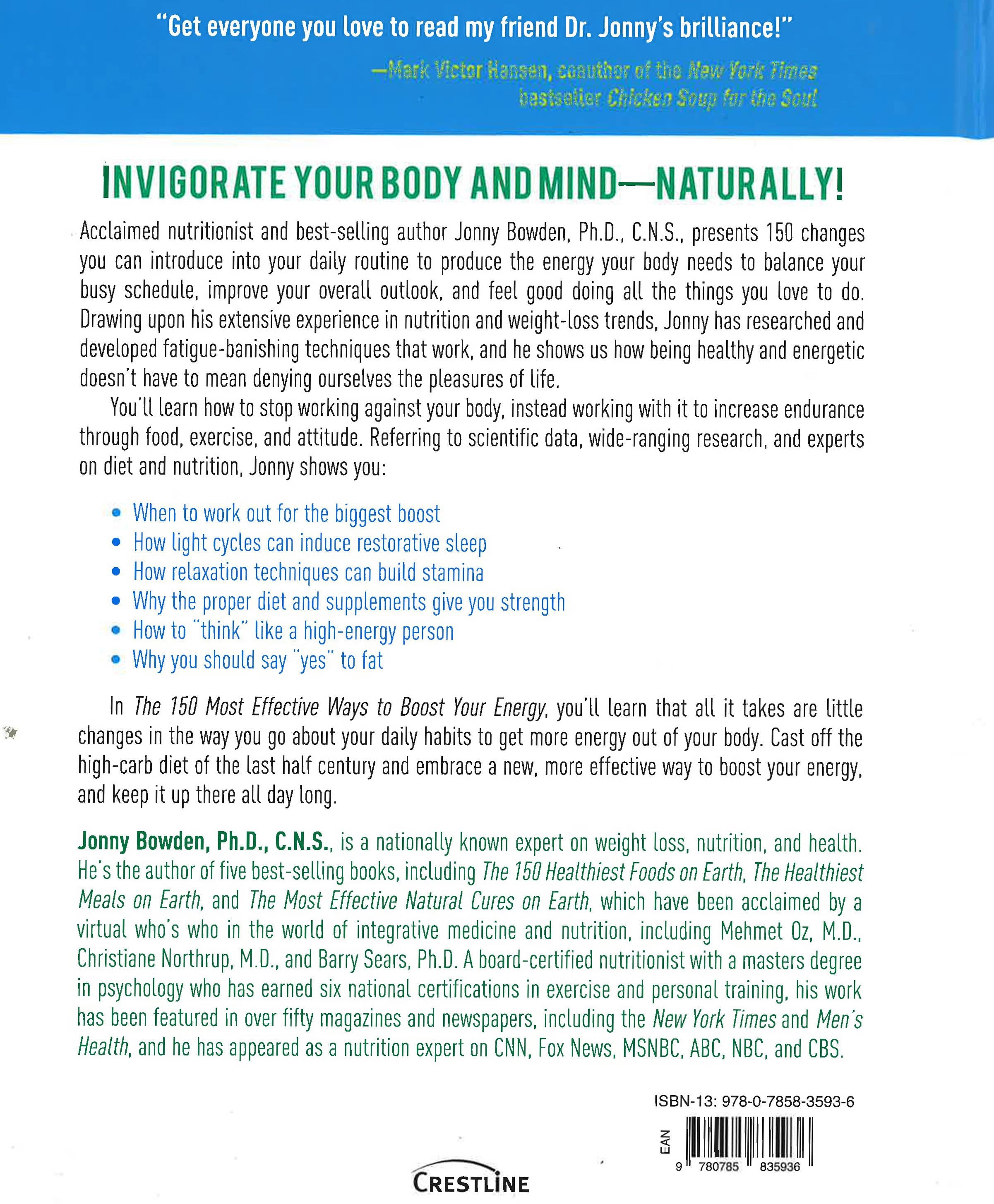 The 150 Most Effective Ways to Boost Your Energy shows anyone how to get more energy out of their body - naturally. Nationally known health expert Jonny Bowden presents small changes anyone can implement up front for big energy - such as what to eat for all-day endurance, when to time a workout for the biggest brain boost, or how working with (or against) natural light cycles can make your sleep restorative or slump-inducing. Energy starts with attitude - you'll learn how to "think" like a high-energy person and use breathing techniques, meditation, and exercise to bust stress, beat fatigue, and boost stamina. You'll also learn how physical factors such as toxins, eating patterns, and nutritional deficiencies can sabotage strength - and how they can be corrected with proper diet and supplements. The 150 Most Effective Ways to Boost Your Energy gives you a complete program to go from exhausted to energized.