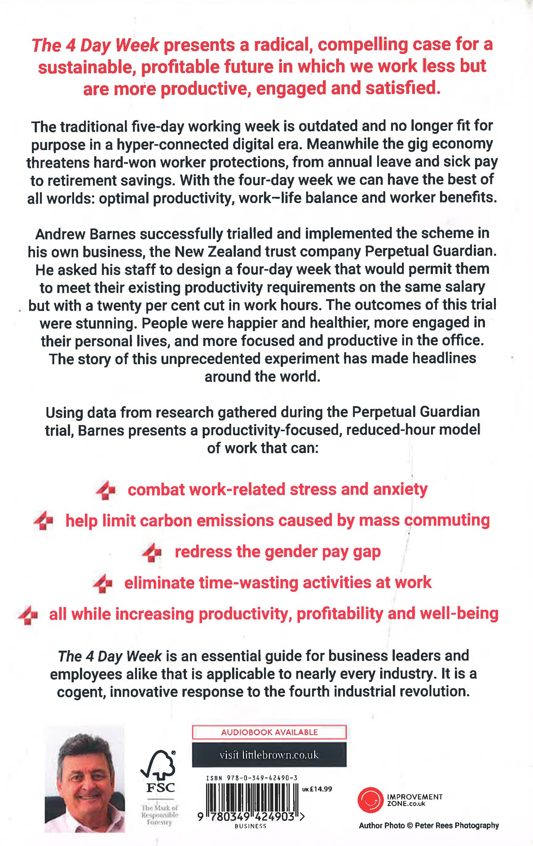 SHORTLISTED FOR THE BUSINESS BOOK AWARDS 2021In The 4 Day Week, entrepreneur and business innovator Andrew Barnes makes the case for the four-day work week as the answer to many of the ills of the 21st-century global economy. Barnes conducted an experiment in his own business, the New Zealand trust company Perpetual Guardian, and asked his staff to design a four-day week that would permit them to meet their existing productivity requirements on the same salary but with a 20% cut in work hours. The outcomes of this trial, which no business leader had previously attempted on these terms, were stunning. People were happier and healthier, more engaged in their personal lives, and more focused and productive in the office. The world of work has seen a dramatic shift in recent times: the former security and benefits associated with permanent employment are being displaced by the less stable gig economy. Barnes explains the dangers of a focus on flexibility at the expense of hard-won worker protections, and argues that with the four-day week, we can have the best of all worlds: optimal productivity, work-life balance, worker benefits and, at long last, a solution to pervasive economic inequities such as the gender pay gap and lack of diversity in business and governance. The 4 Day Week is a practical, how-to guide for business leaders and employees alike that is applicable to nearly every industry. Using qualitative and quantitative data from research gathered through the Perpetual Guardian trial and other sources by the University of Auckland and Auckland University of Technology, the book presents a step-by-step approach to preparing businesses for productivity-focused flexibility, from the necessary cultural conditions to the often complex legislative considerations. The story of Perpetual Guardian's unprecedented work experiment has made headlines around the world and stormed social media, reaching a global audience in more than seventy countries. A mix of trenchant analysis, personal observation and actionable advice, The 4 Day Week is an essential guide for leaders and workers seeking to make a change for the better in their work world.