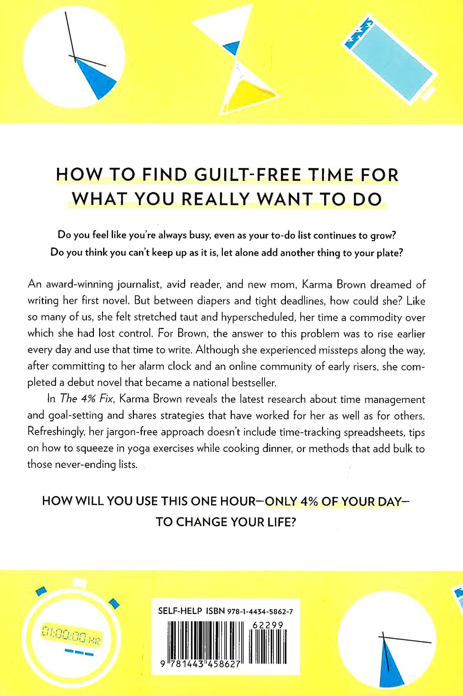 In The 4% Fix, Karma Brown reveals the latest research about time management and goal-setting and shares strategies that have worked for her as well as for others. Refreshingly, her jargon-free approach doesn&;t include time-tracking spreadsheets, tips on how to squeeze in yoga exercises while cooking dinner, or methods that add bulk to those never-ending lists.